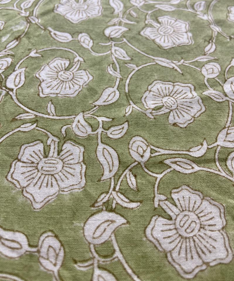 Tela de Algodón Estampada a Mano con Diseño de Enredadera Floral en Verde Oliva