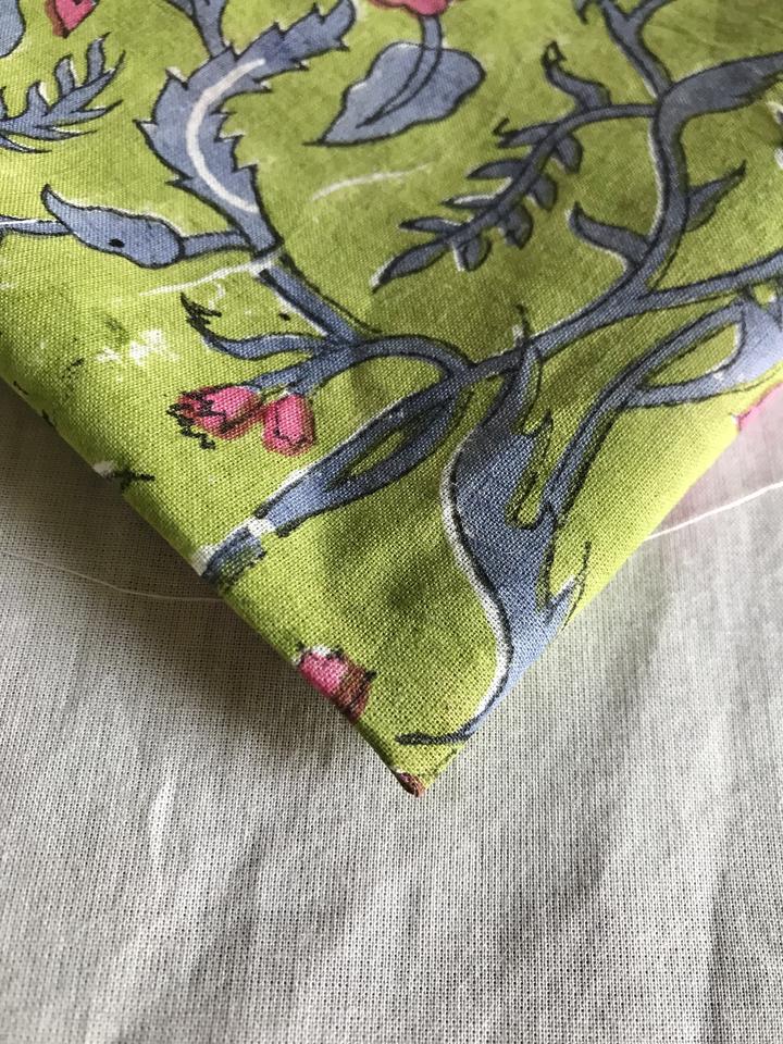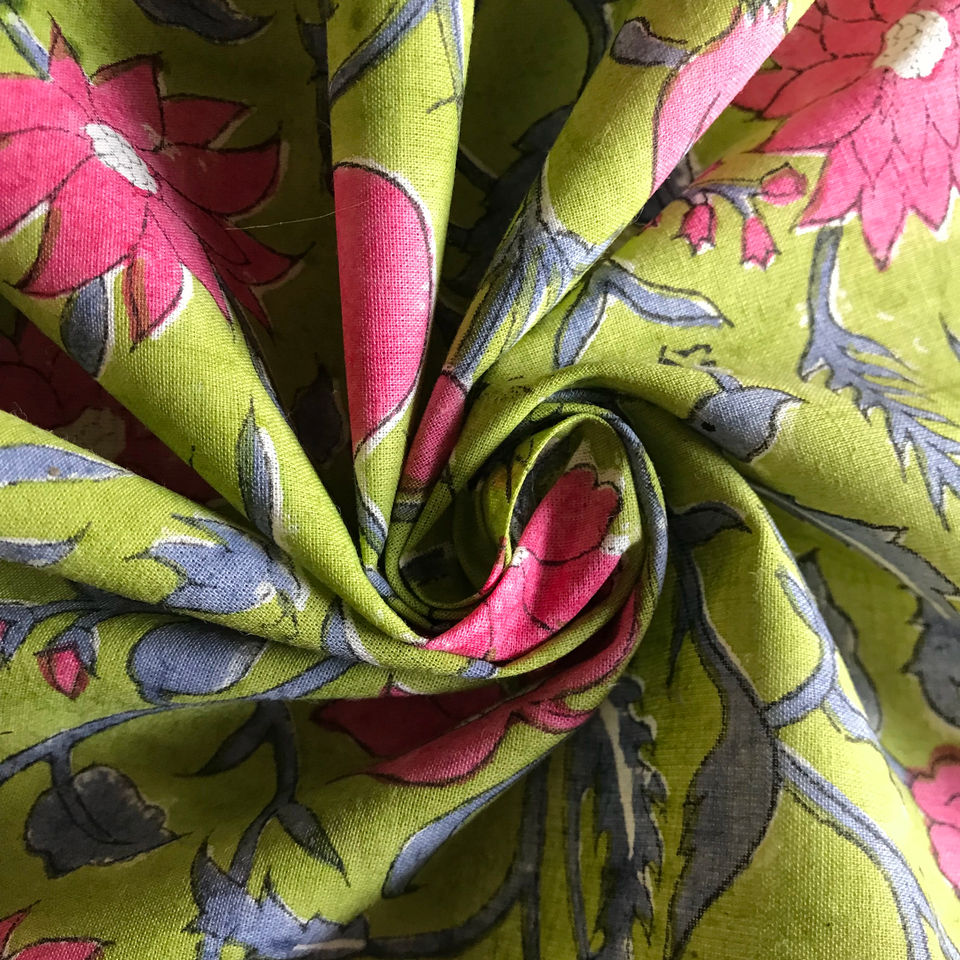 Tela de Algodón Estampada a Mano con Diseño de Enredaderas Florales Verde Oliva con Flores Rosas y Hojas Índigo | Textil Étnico Indio
