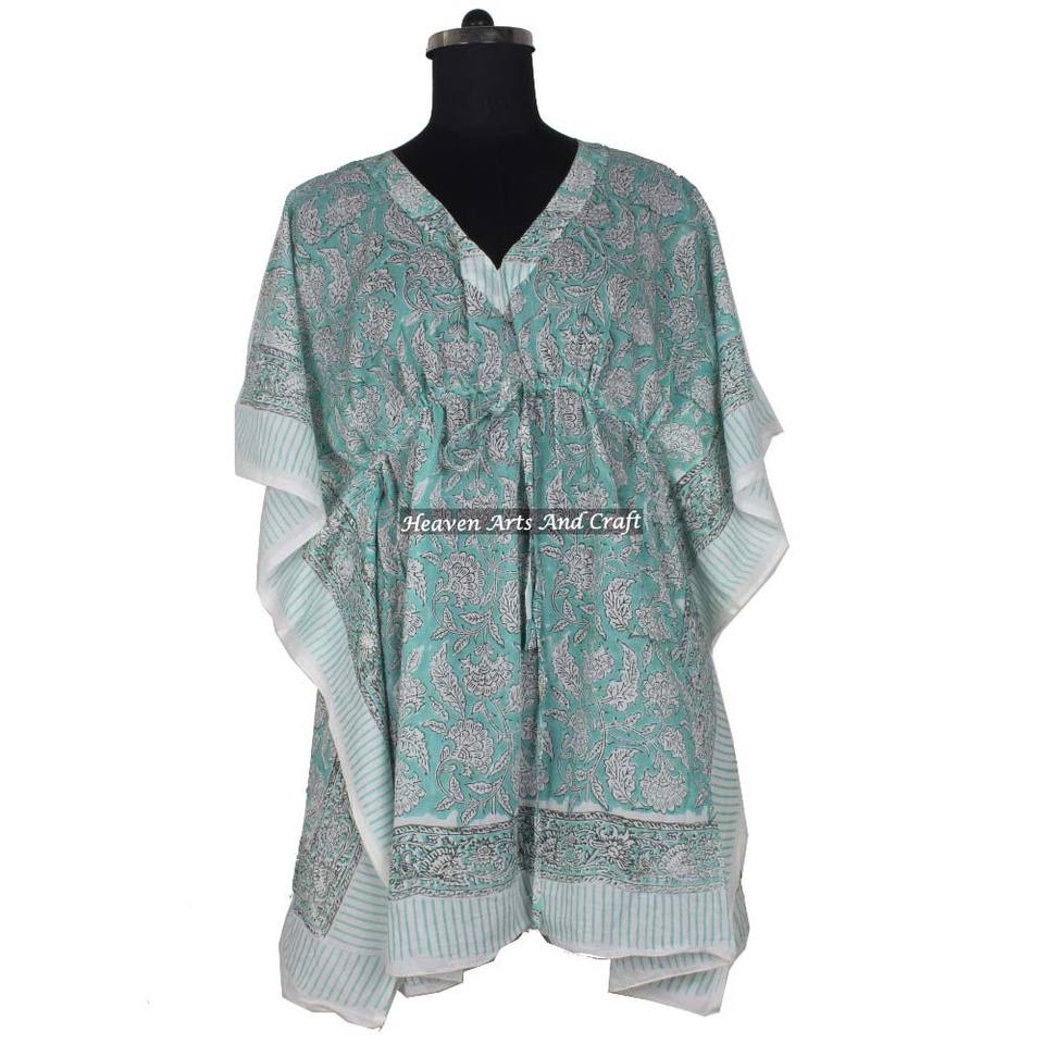 Caftán de Algodón Estampado a Mano, Abaya India Hecha a Mano, Diseño Maxi KFCS024 con Mangas Cortas, Talla XL, Estilo Dubái