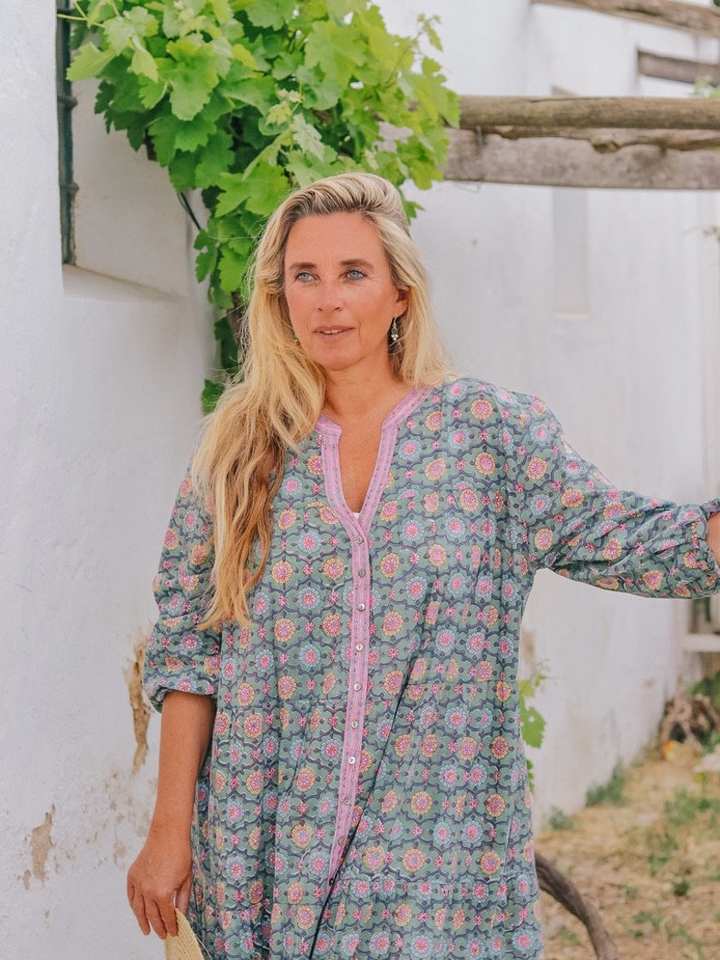 Maxi vestido de algodón estampado bloque de mano verde Boho Resort Wear