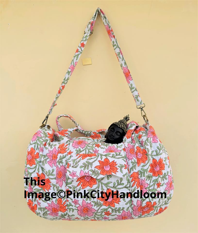Bolso de algodón con estampado de bloque de mano con estampado Floral de espacio Extra, bolsos de lona de fin de semana, bolso de viaje de tela acolchada para mujer para unisex