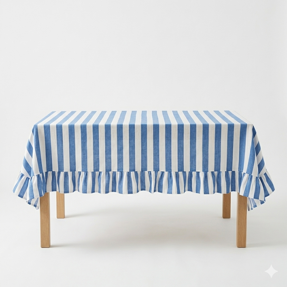 Mantel de algodón estampado a mano, con rayas náuticas azules y blancas, dobladillo con volantes, juego de mantel y cubierta de mesa de lino