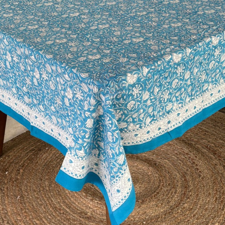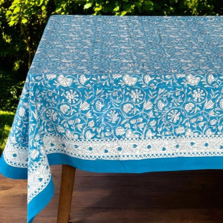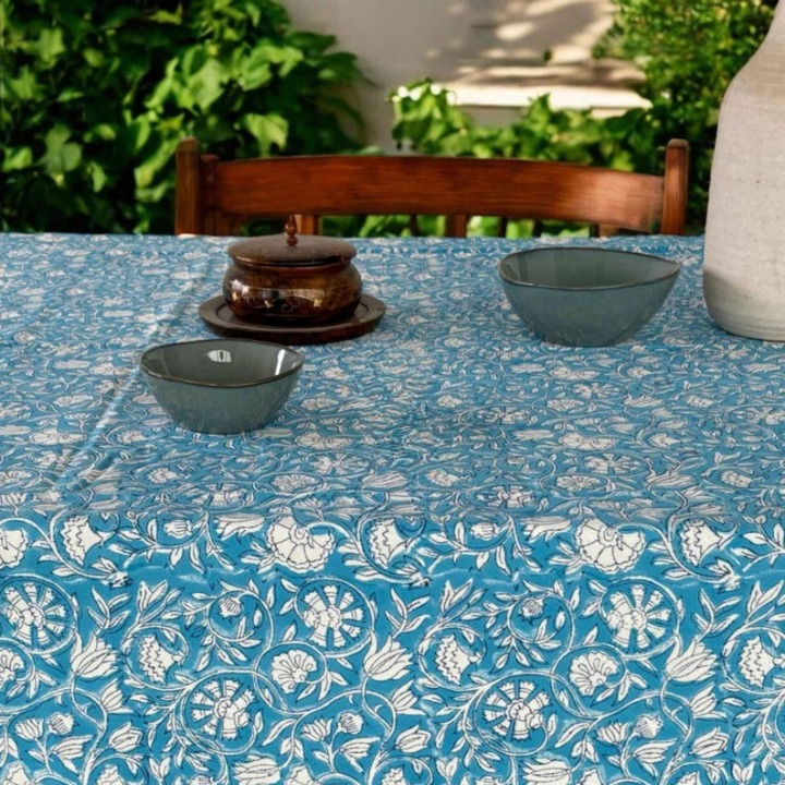 Mantel de comedor estampado a mano azul y blanco, mantel indio estampado a mano, juego de cubierta de mesa de lino