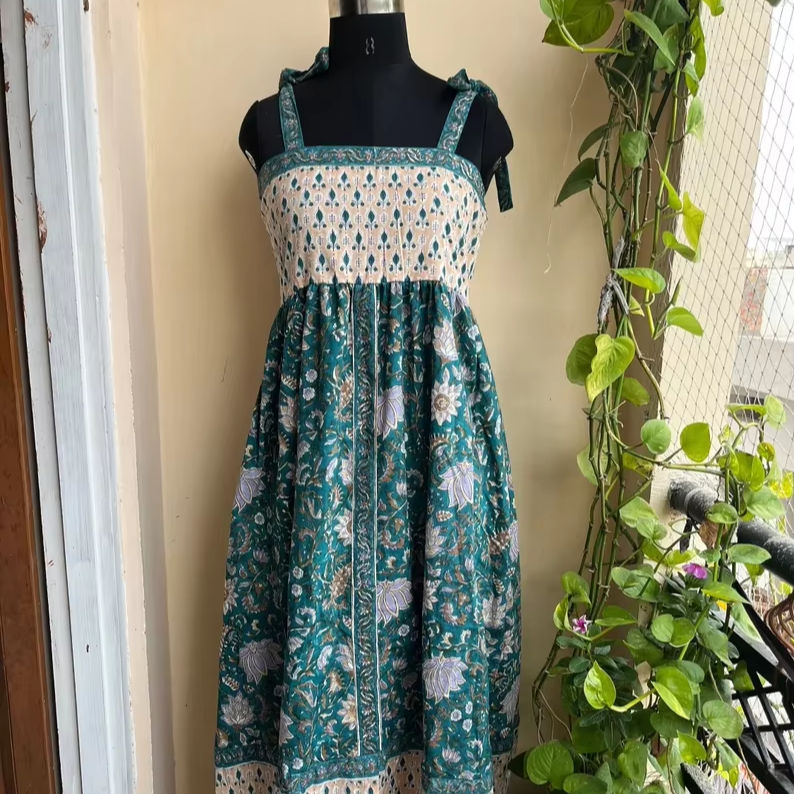 Vestido de algodón indio con estampado de bloques a mano, Vestido largo de algodón 100% con cuello cuadrado bordado Floral, túnicas