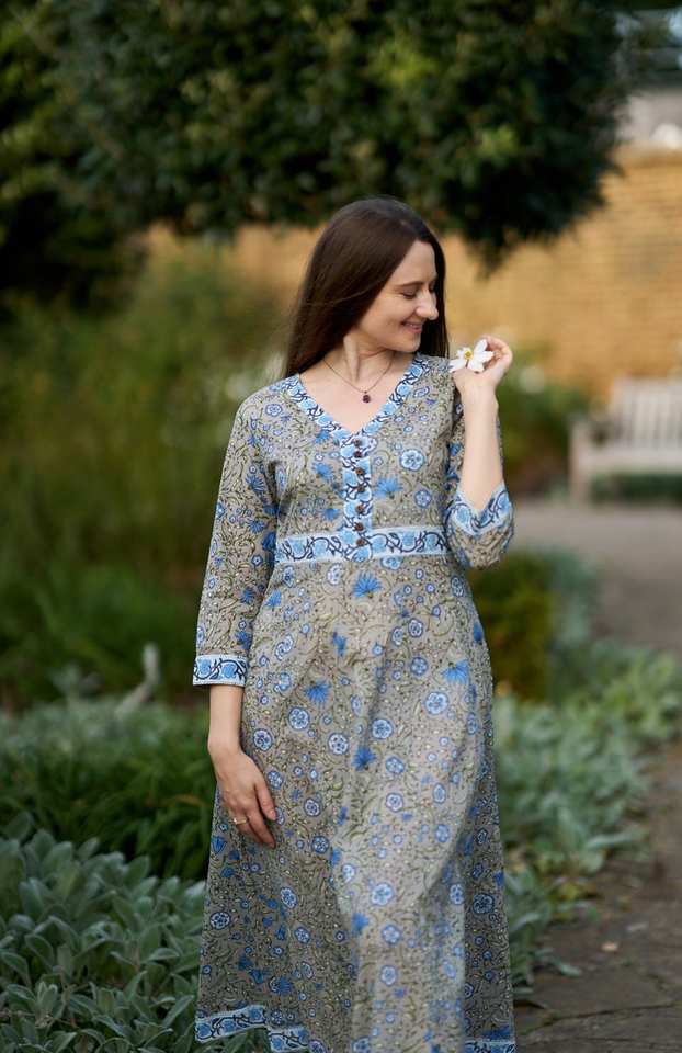Vestido Islanna Estampado a Mano, Estilo Bohemio, Algodón Puro, Informal, para Ocasiones Especiales, Vacaciones, Verano, Gris Azul, Hecho a Mano, Moda Ética