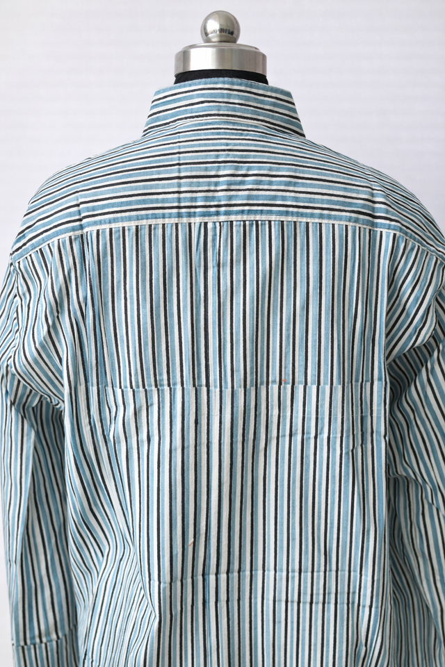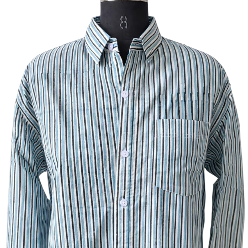 Camisa de algodón a rayas con estampado a mano | Camisa Verde y Blanca con Botones | Camisa Unisex Hecha a Mano por Artesanos | Top de Moda Sostenible