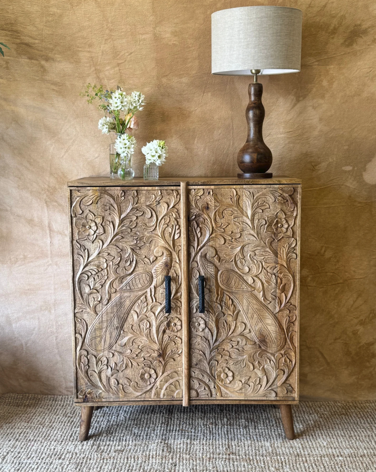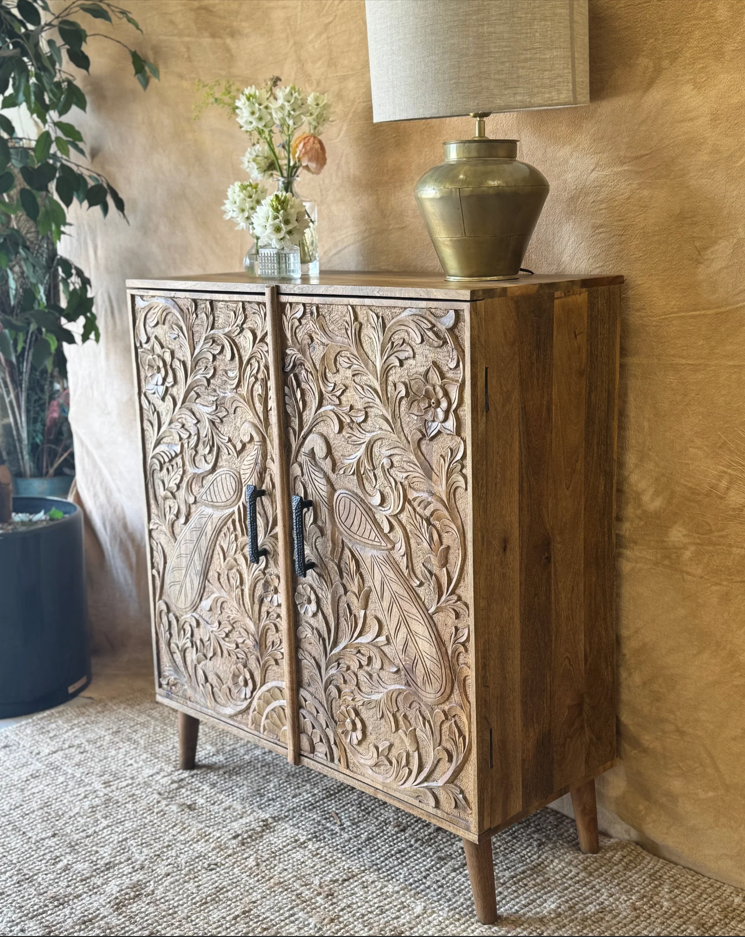 Aparador de madera de mango tallado a mano con motivo de pavo real con acabado natural