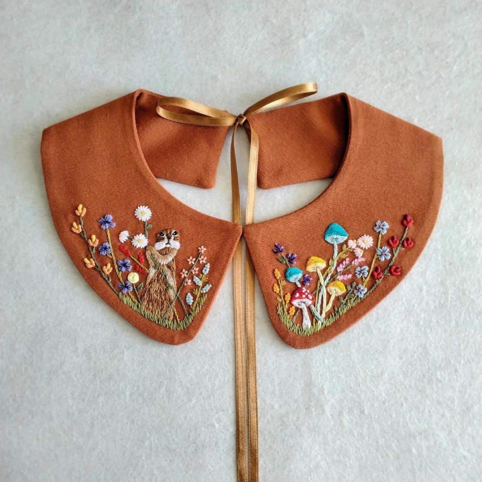 Collar bordado a mano, collar desmontable con pájaro Petirrojo, cuello vintage de lino, collar hecho a mano, accesorio de uso bohemio