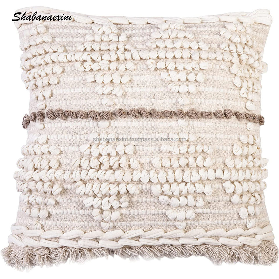 Funda de cojín bohemio bordado a mano para sala de estar fundas de almohada de lana bohemia de algodón con borlas negras hechas en la India