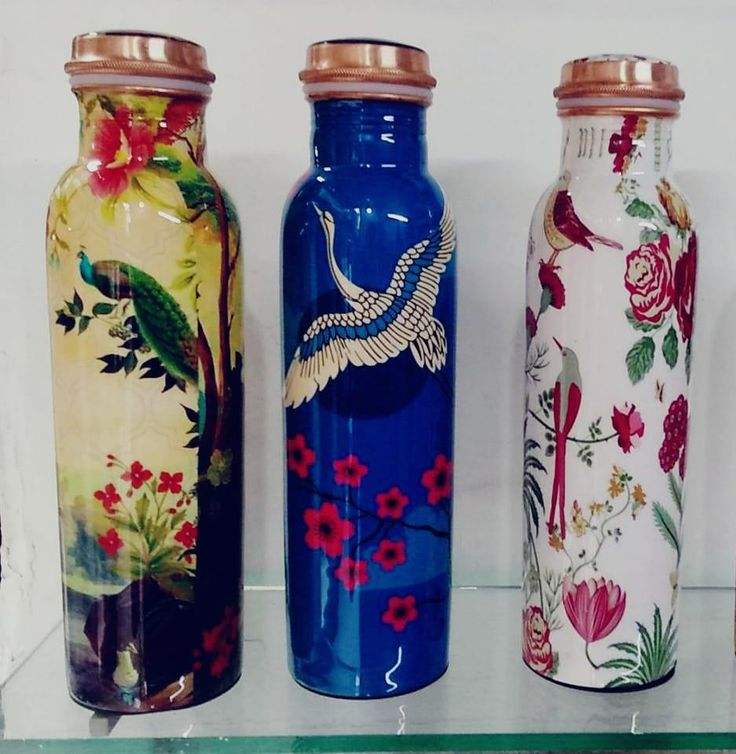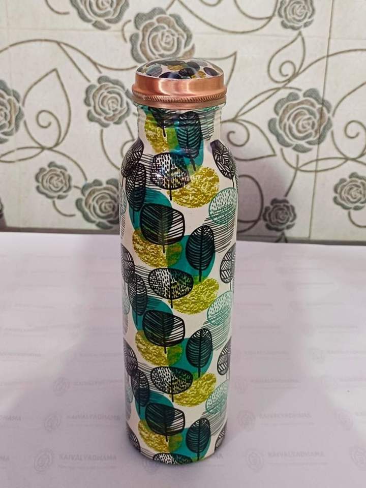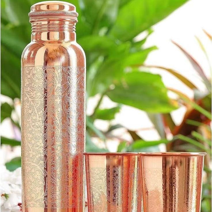 Juego de botella de agua de cobre puro con patrón floral grabado a mano y dos vasos para mesa de bienestar, comedor saludable y agua mineral.