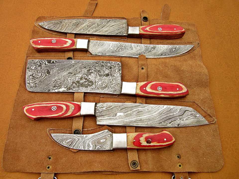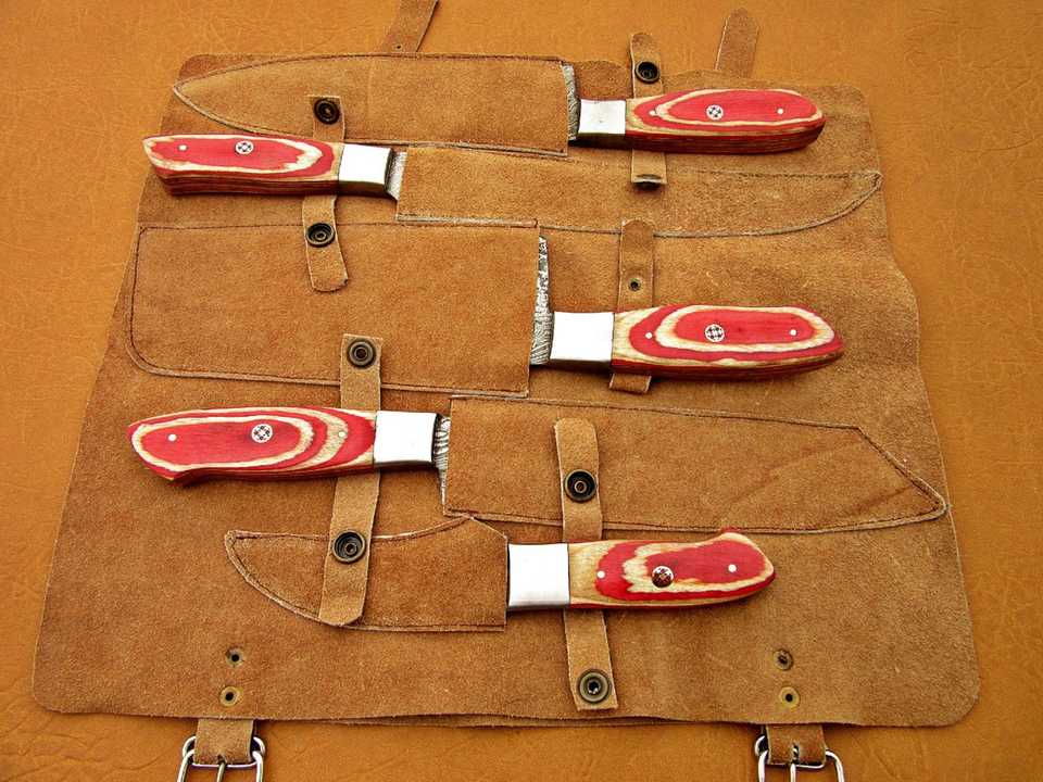Juego de cuchillos de Chef de hoja de acero de Damasco forjado a mano, bolsa de transporte de cuero con refuerzo de acero inoxidable de madera Pakka, hermoso OEM