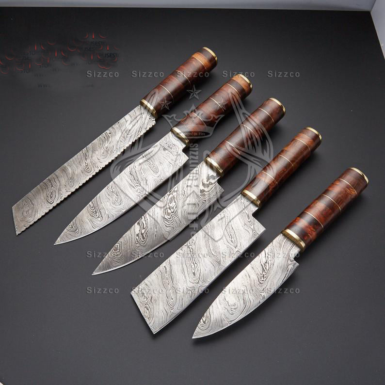 Juego de cuchillos de chef de acero de Damasco forjado a mano de 5 Juegos de cuchillos para barbacoa y cocina con bolsa de cuero