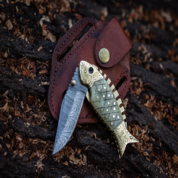 Navaja de Bolsillo Plegable de Acero de Damasco Forjada a Mano, Grado Industrial, Funda de Cuero, Bloqueo Interno, OEM, Garantía de 3 Años, para Camping