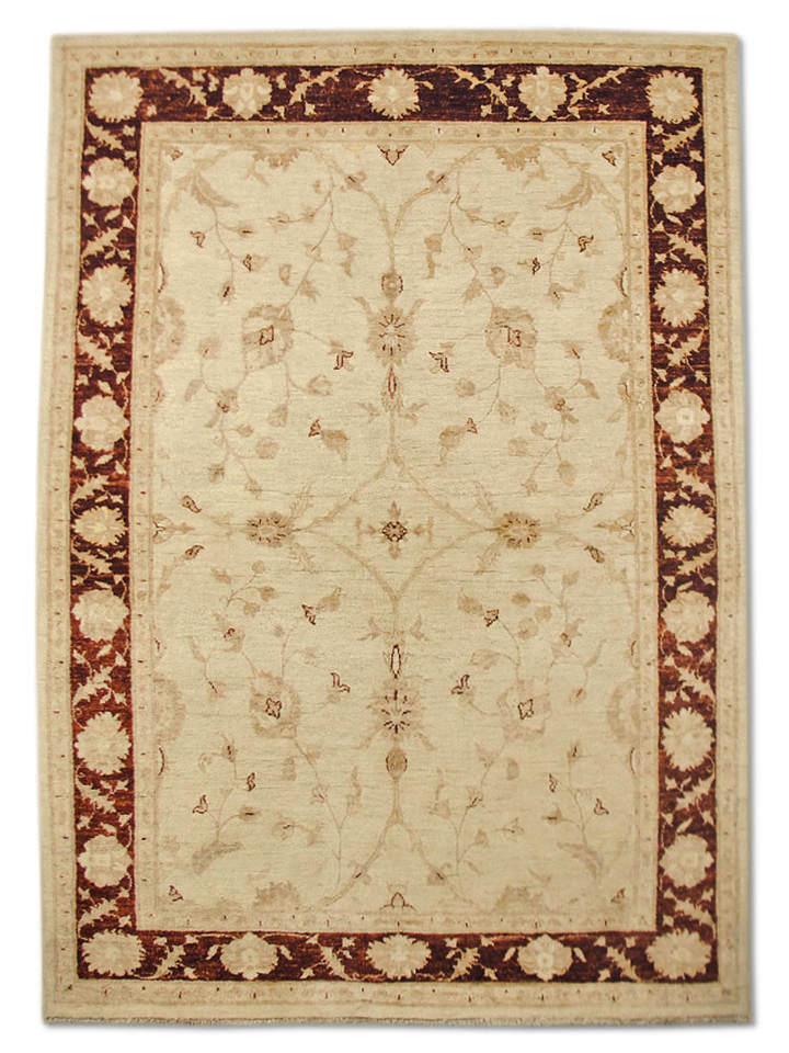 Alfombra de Lana Tejida a Mano con Punto de Cruz, Ecológica, Geométrica, con Borde Color Crema y Óxido, Estilo Tradicional Chobi, Moderna, Beige y Roja