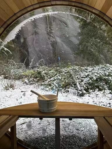 Sauna de barril para exteriores de cedro rojo con área de descanso en el porche