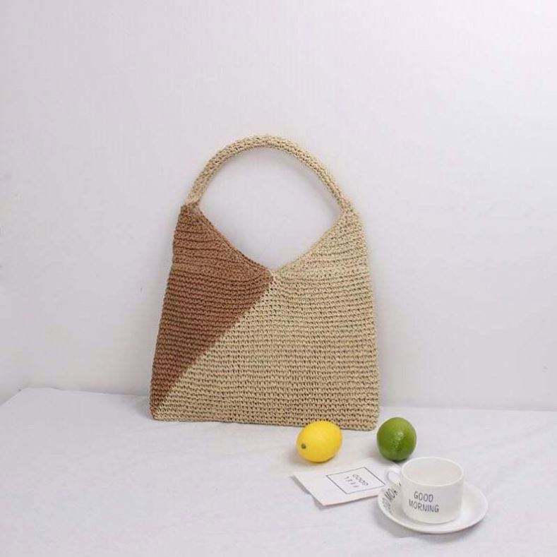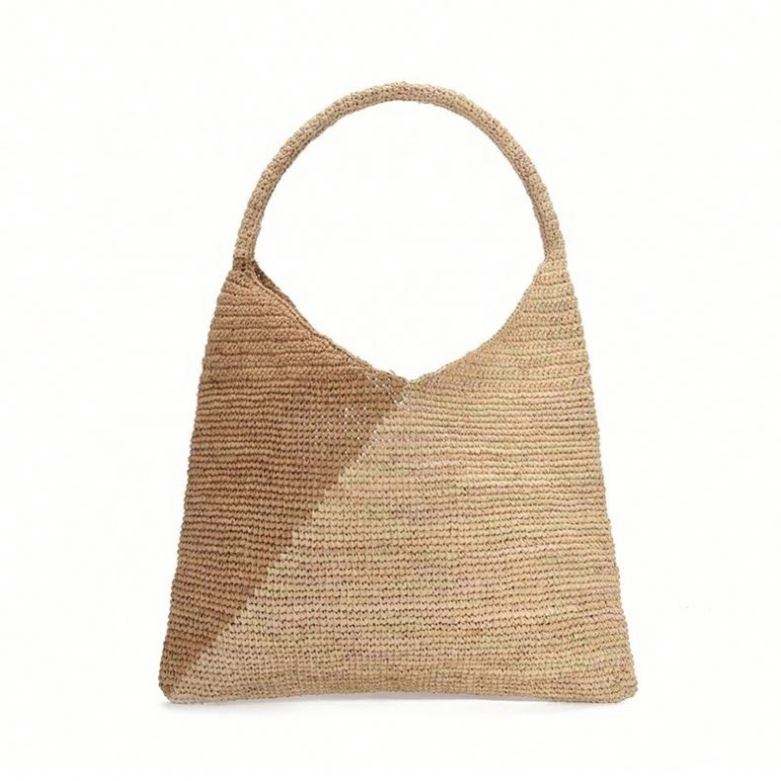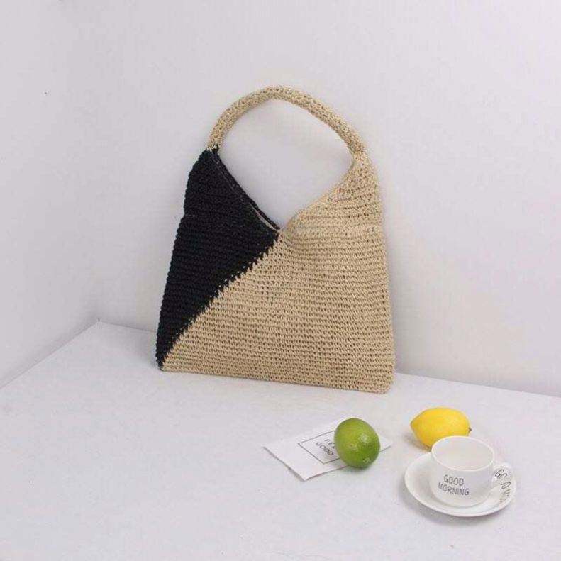Bolso de Playa de Rafia Fina Hecho a Mano para Mujer, Bolso Tote de Paja de Papel Tejido a Crochet de Dos Tonos para Viajes de Verano