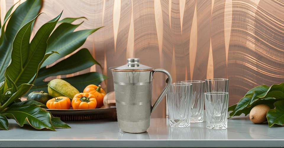 Jarra de agua de cobre de lujo hecha a mano jarra de cobre puro con revestimiento de acero inoxidable para un estilo Ayurveda indio de larga duración