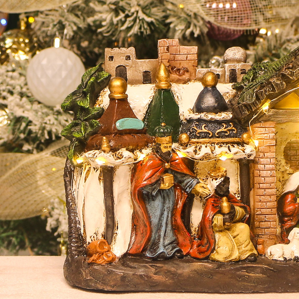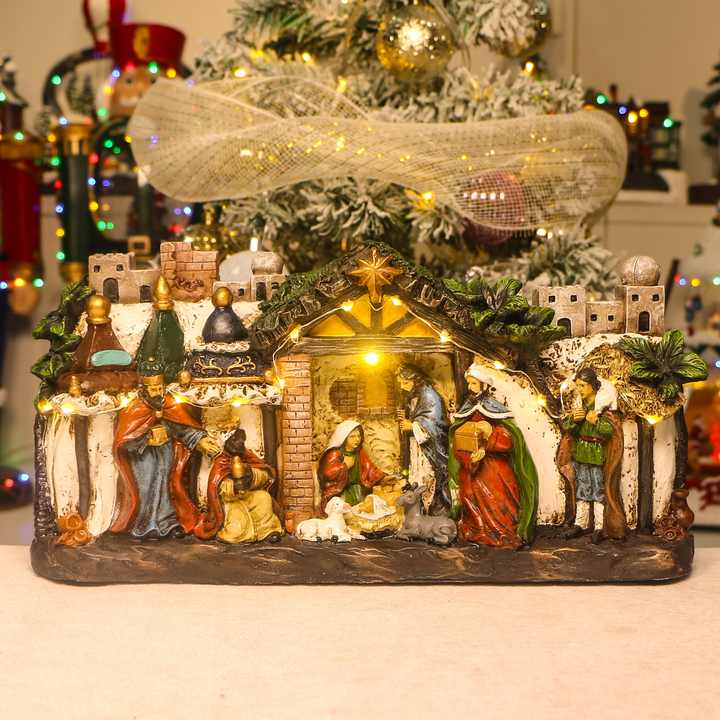 Set de Nacimiento de Resina Pintado a Mano para Navidad con Luz LED, Pinturas de Jesucristo, Decoración Religiosa Navideña