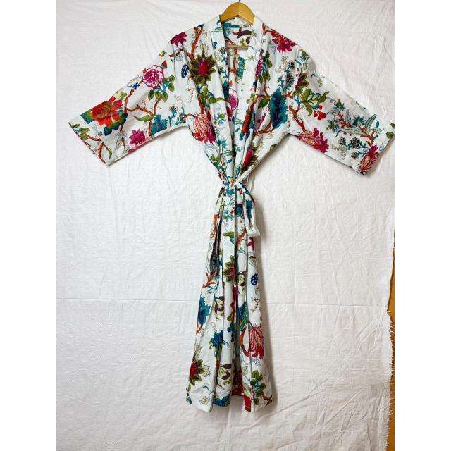 Bata Kimono de Algodón Estampada a Mano: Chaqueta Ligera Azul Estilo Boho para Invierno con Cinturón, Venta al por Mayor