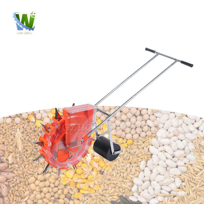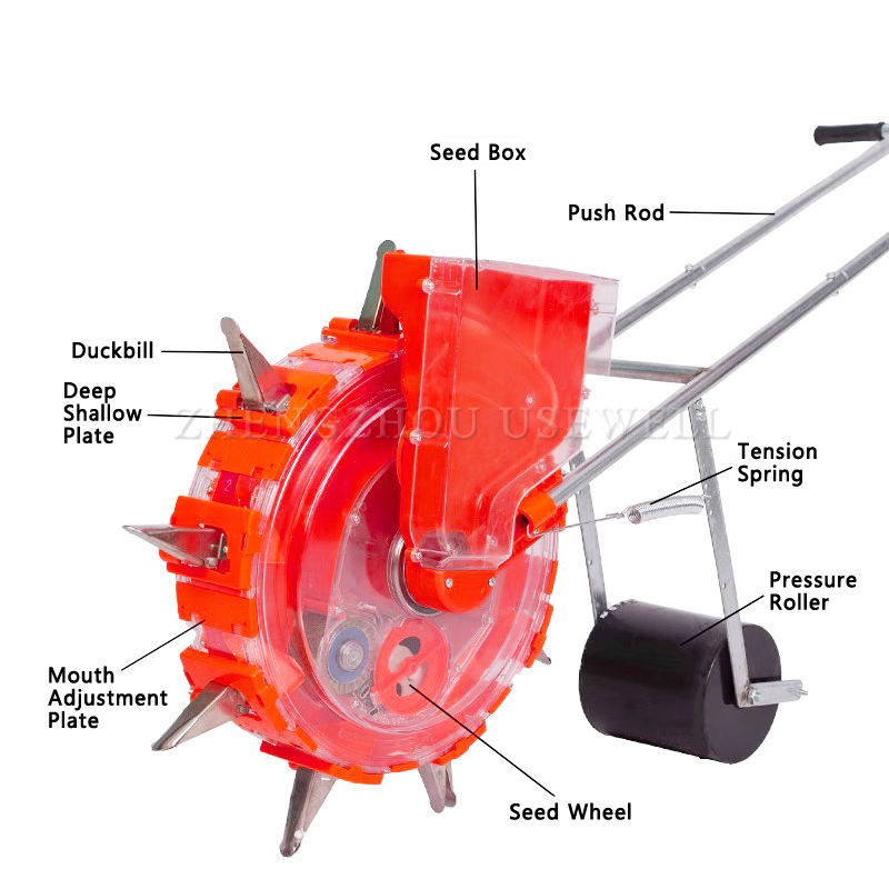 Rodillo de empuje manual Rueda de siembra de precisión Esparcidores de fertilizante de césped Cereales de maní La máquina de siembra de semillas de soja se embalará en la caja de cartón estándar de exportación.