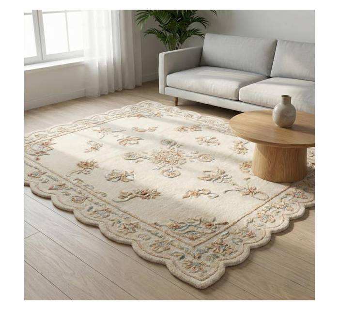 Alfombra de lana hecha a mano con borde festoneado y diseño floral en 3D, alfombra blanca con flores festoneadas, alfombra con patrón floral en 3D.