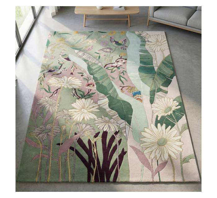 Alfombra de Lana Hecha a Mano con Diseño Botánico 3D Tallado en Relieve, Diseño de Aves y Flores Silvestres, Alfombra Personalizada Verde Menta con Motivos Florales