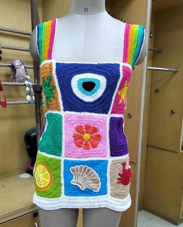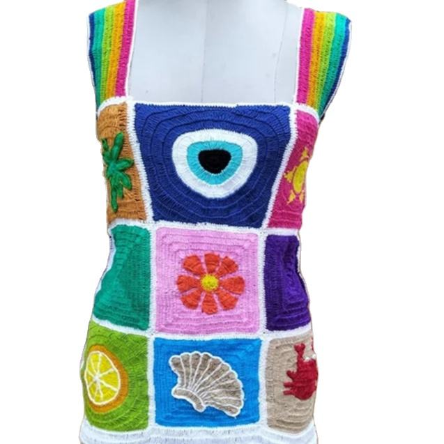 Mini vestido de trabajo con parche multicolor de ganchillo a mano con motivos hechos a mano de inspiración natural
