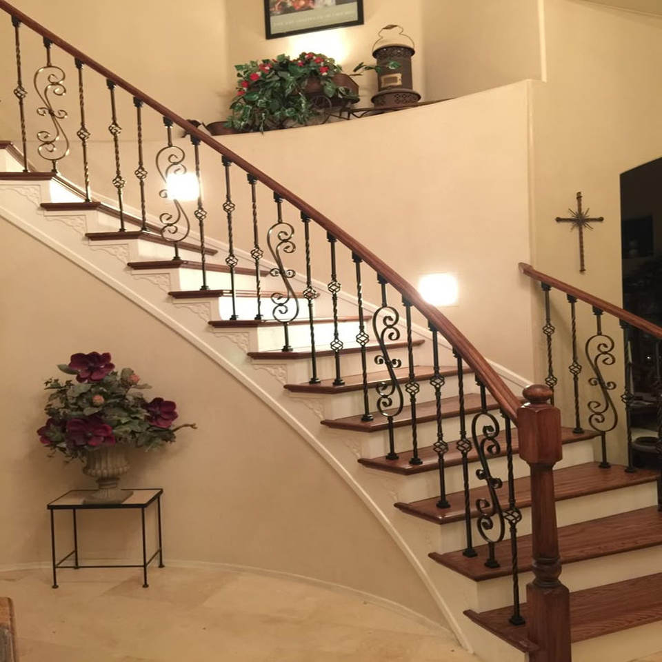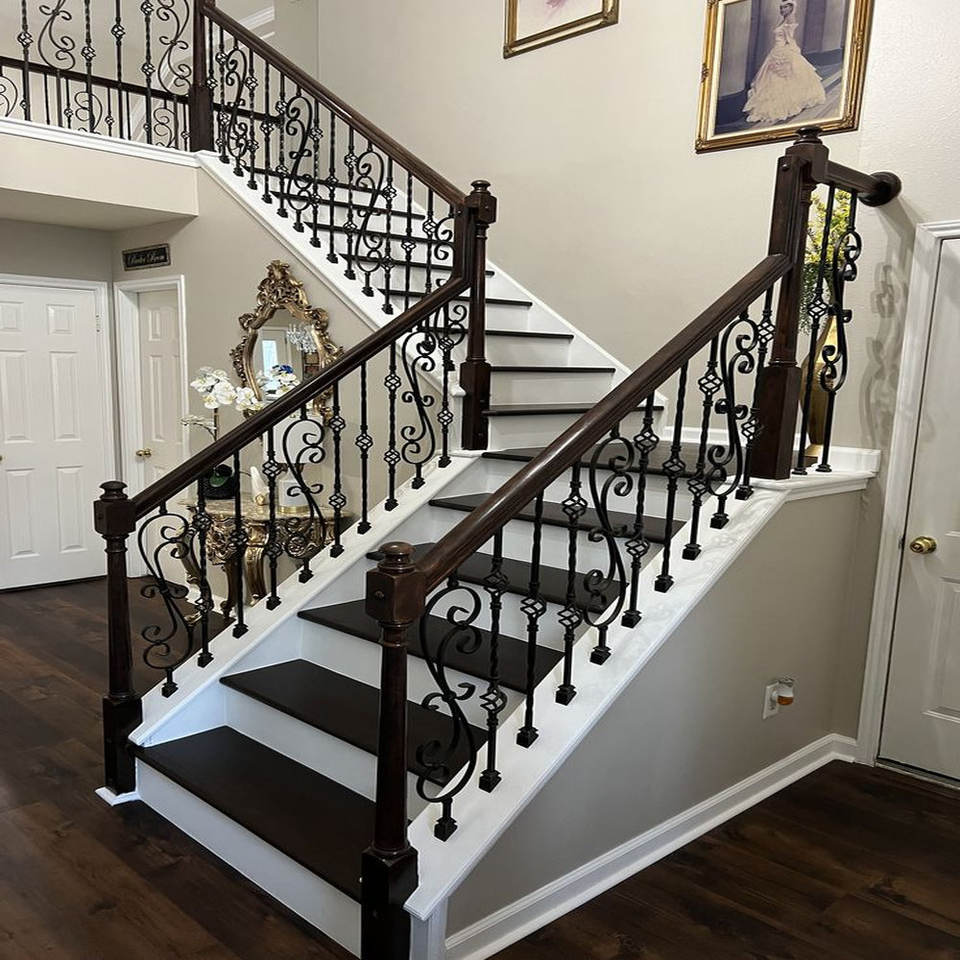 Barandilla de escalera de hierro forjado forjada a mano de fabricación vietnamita con superficie recubierta de polvo y detalles artísticos forjados
