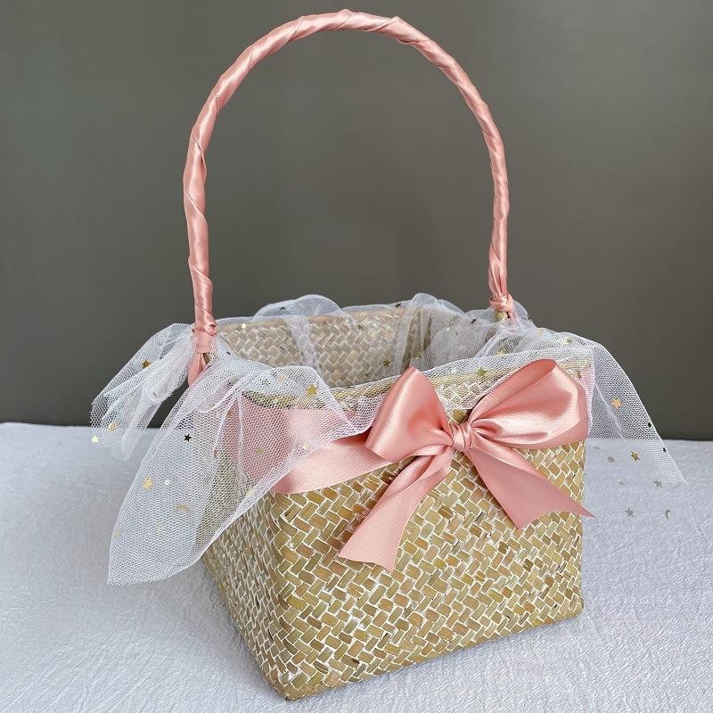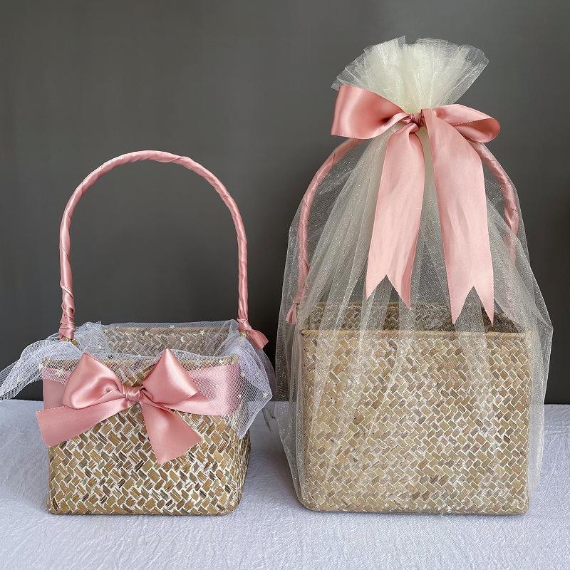 Caja de regalo de boda de mano cesta de paja fiesta de cumpleaños recepción boda damas de honor regalo cesta tejida a mano al por mayor