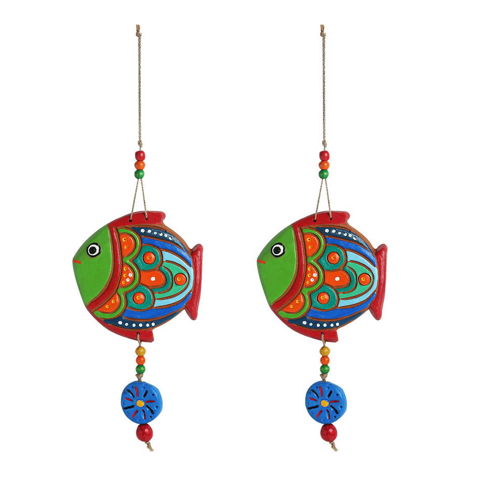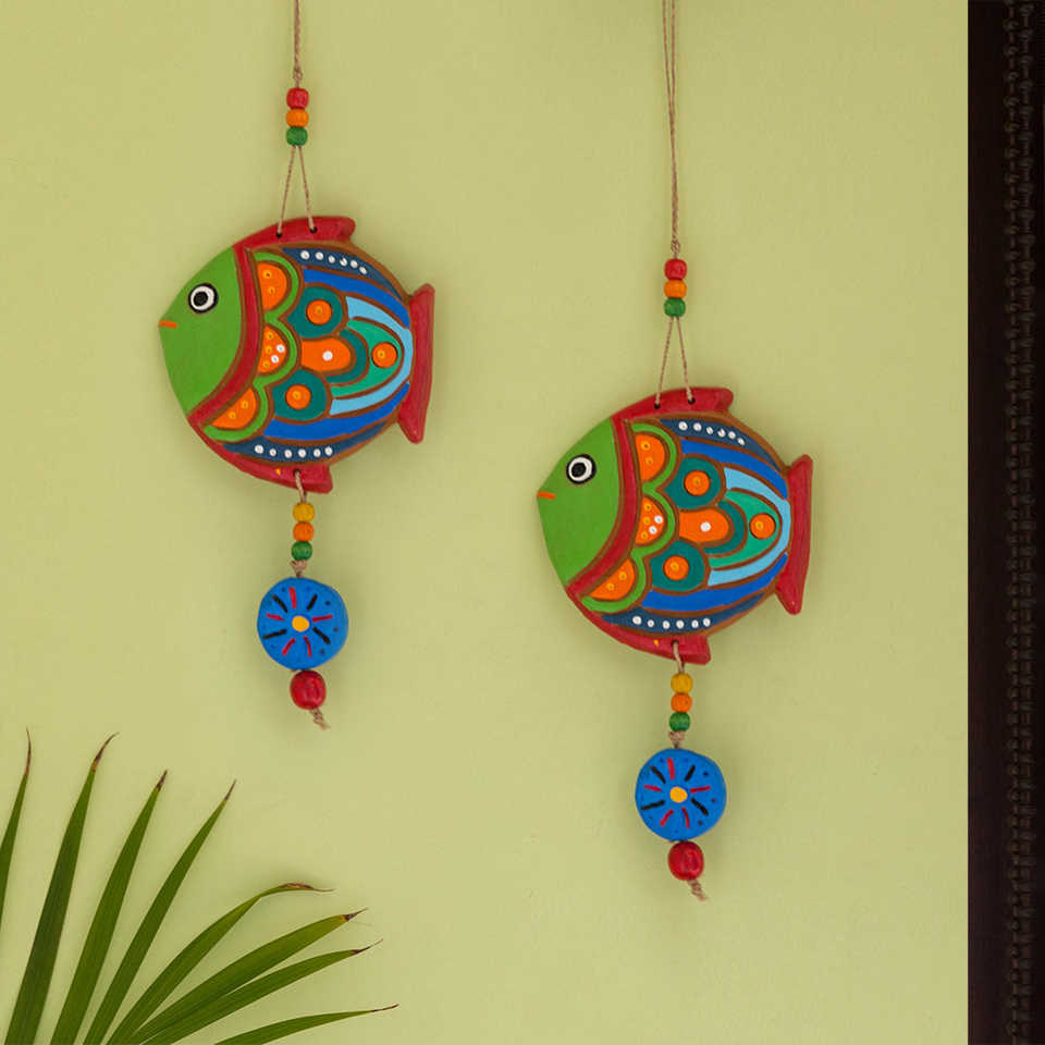 Colgante de pared con forma de pez pintado a mano, diseño tradicional de terracota, estilo de cerámica Vertical, decoración de pared para el hogar, juego de Arte 2 para bodas