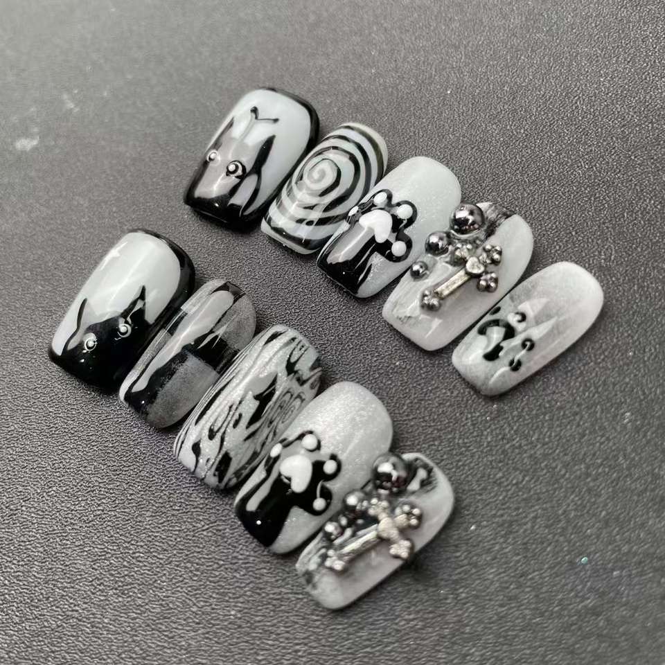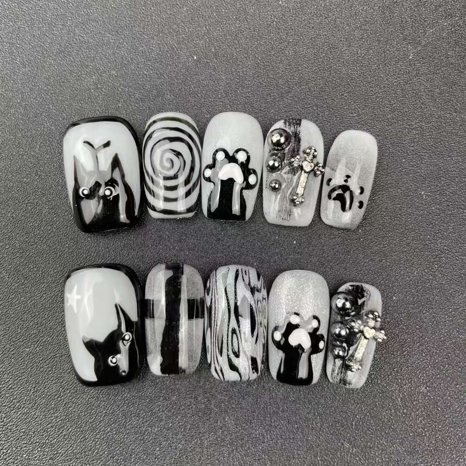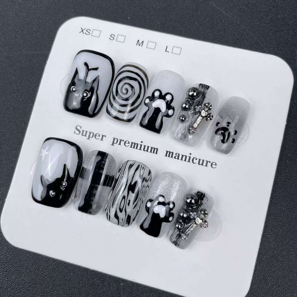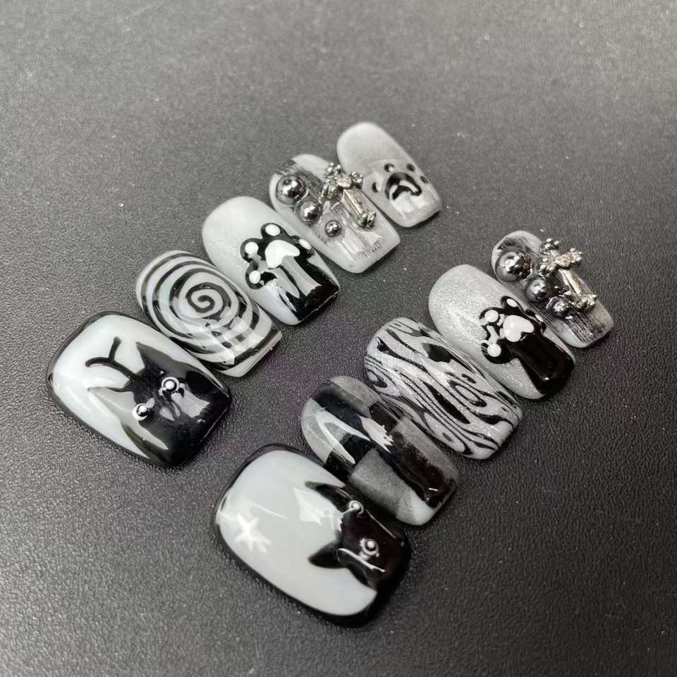 Uñas Cortas Pintadas a Mano con Elementos Circulares de Gato de Alta Calidad al Estilo de Crocs, Reutilizables, Venta al por Mayor de Fábrica.