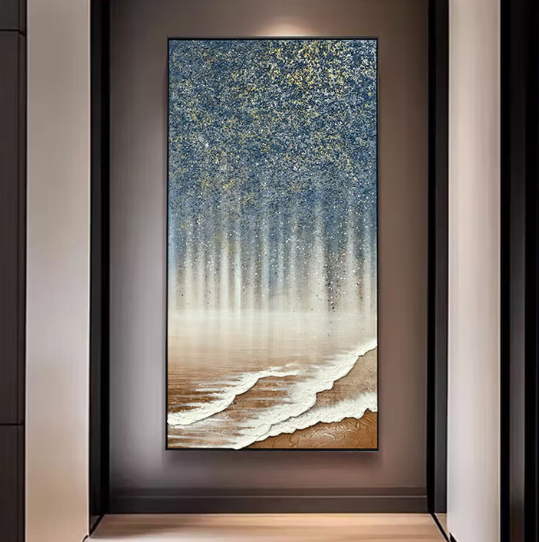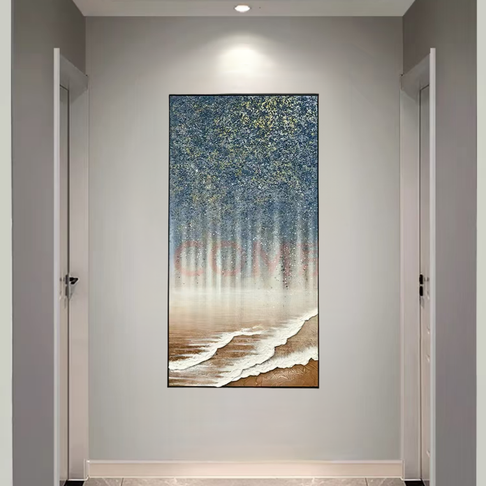 Pintura al Óleo de Textura Tridimensional Pintada a Mano, Cielo Estrellado y Mar