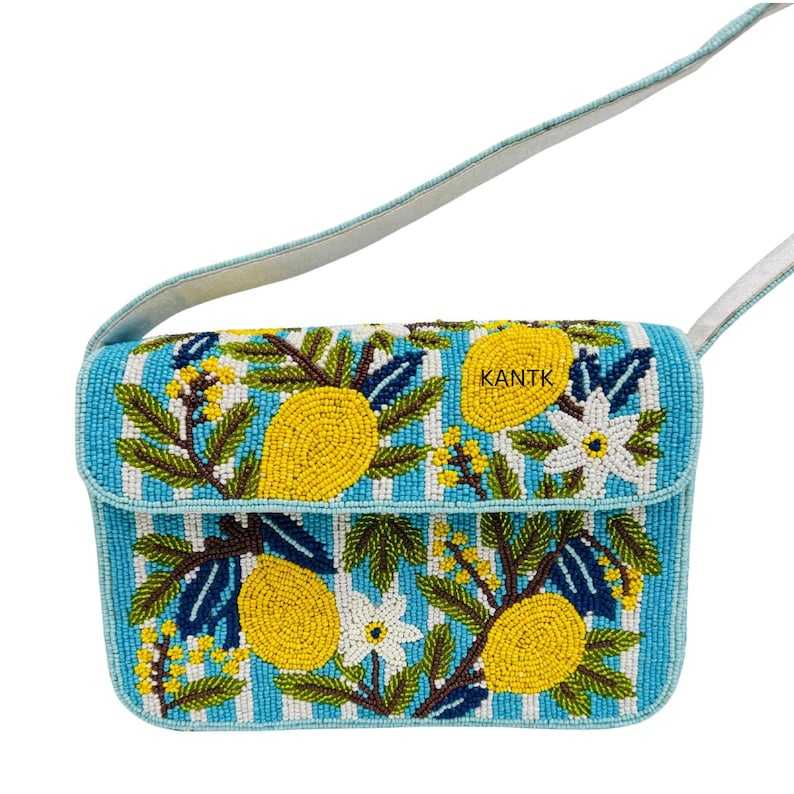 Bolso de hombro hecho a mano con cuentas de limón Bolso de hombro con cuentas de cítricos Bolso de verano tropical Bolso de mano con cuentas artesanales