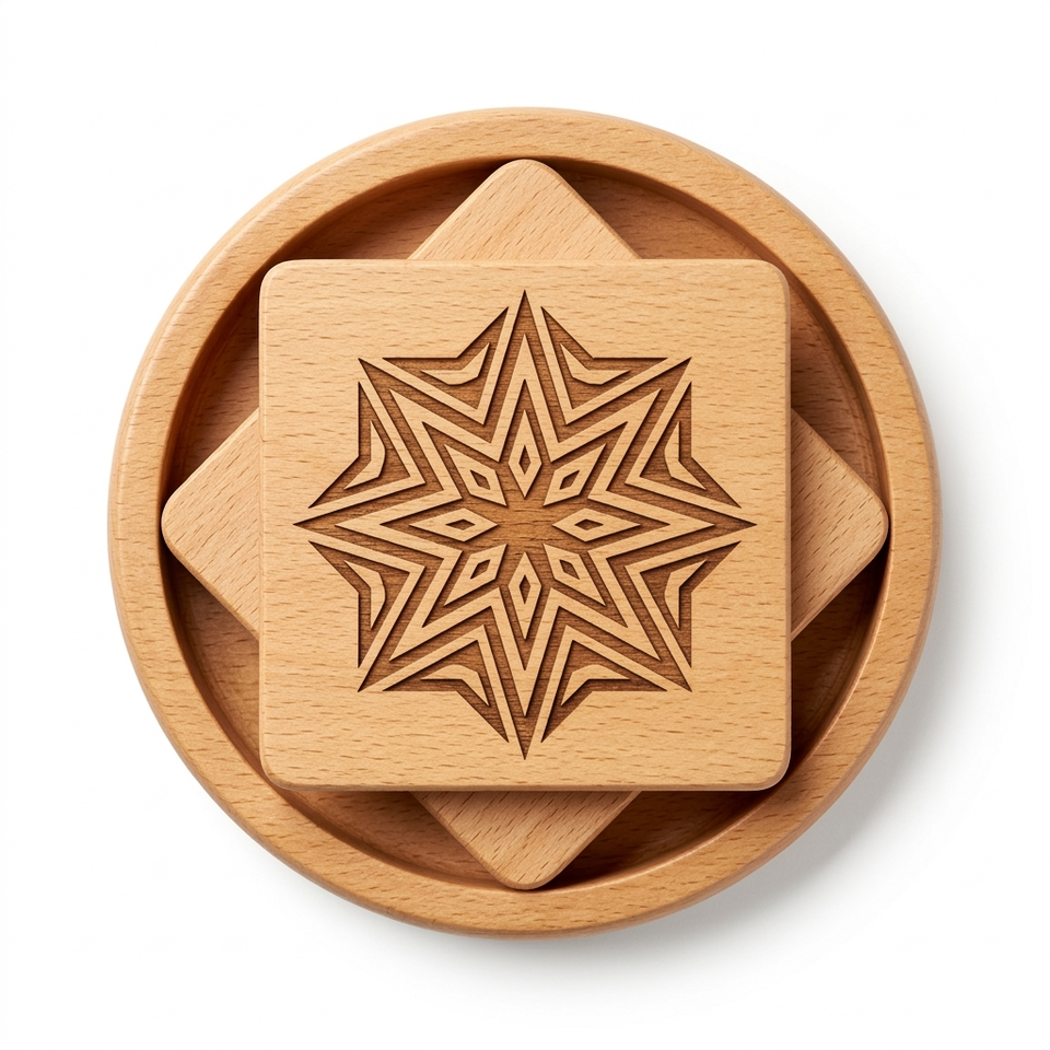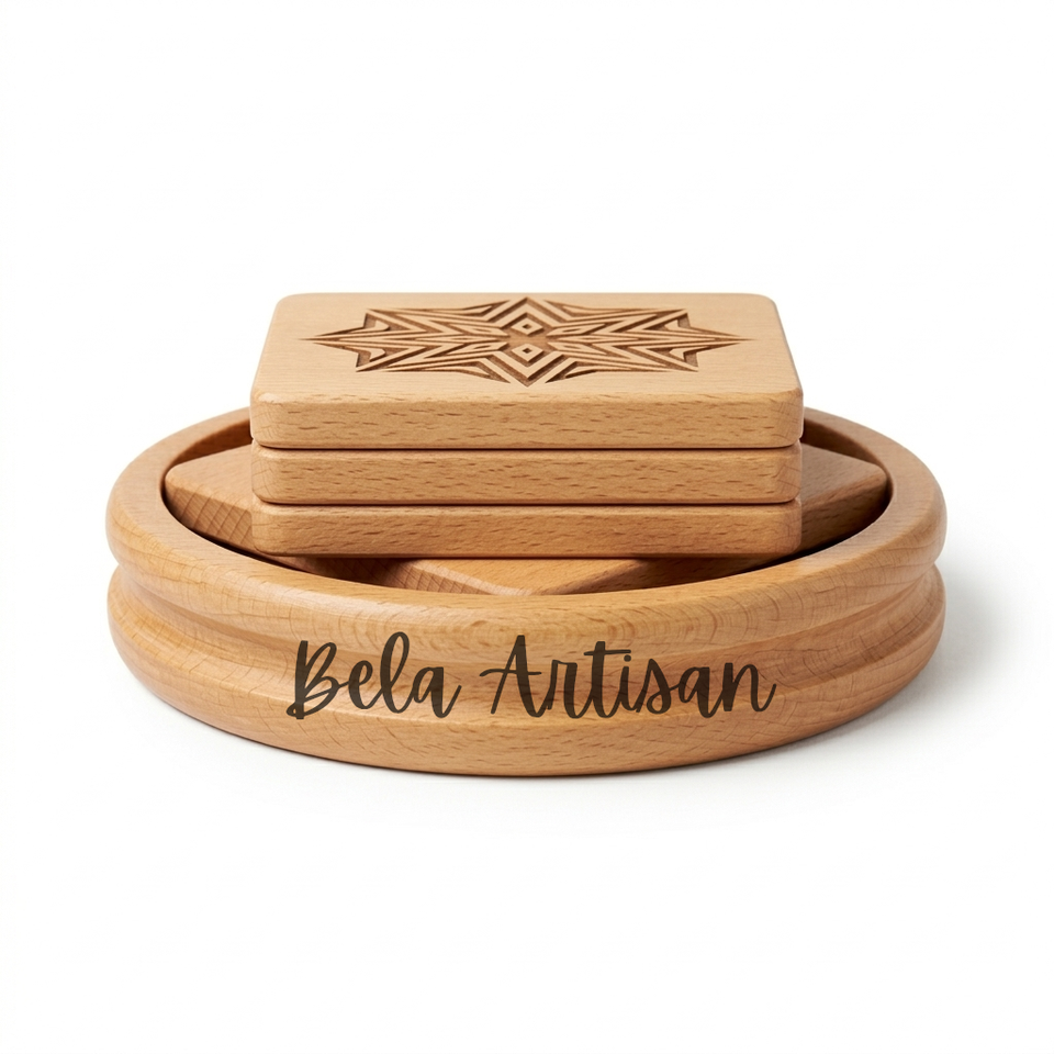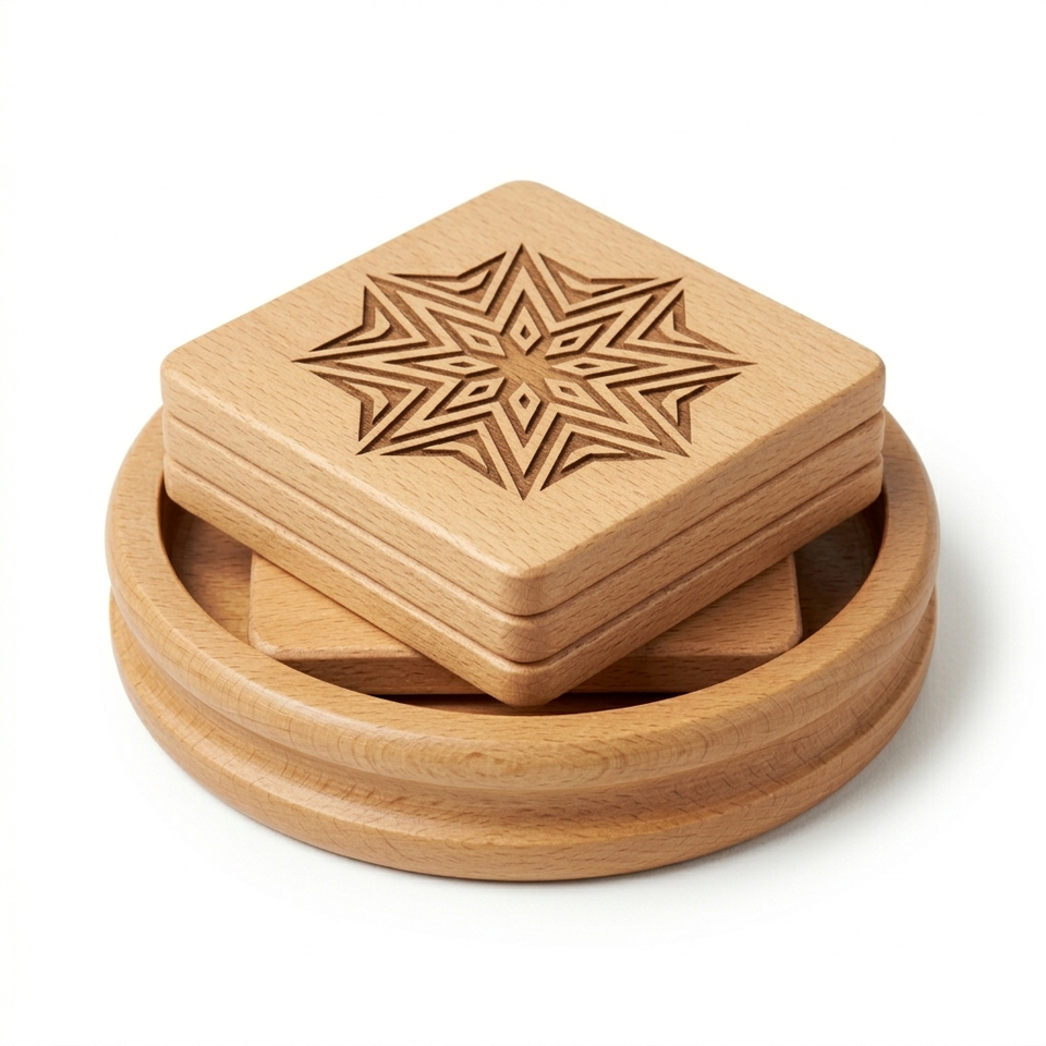 Juego de Posavasos Cuadrados de Madera de Haya Hechos a Mano con Soporte, Acabado Natural, Patrón de Estrella Geométrica, Estilo Moderno Rústico, para Bebidas Frías/Calientes, Bodas, Diwali
