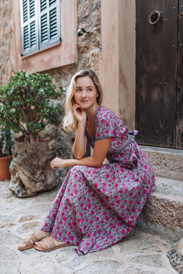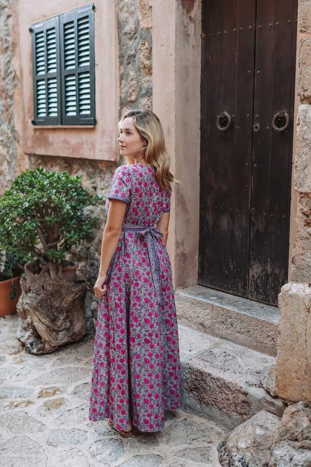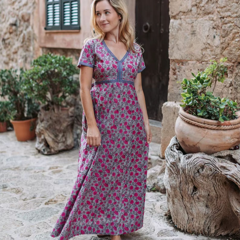 Vestido Bellerose Hecho a Mano, Estilo Bohemio, Estampado a Mano, Algodón Casual, Informal, de Algodón Puro, Floral, Veraniego