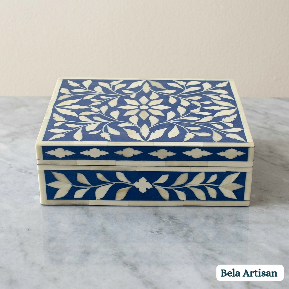 Caja de Recuerdos Artesanal con Incrustaciones de Hueso Azul, Diseño Floral, Organizador Decorativo para Joyas y Recuerdos, para Baño o Sala de Estar