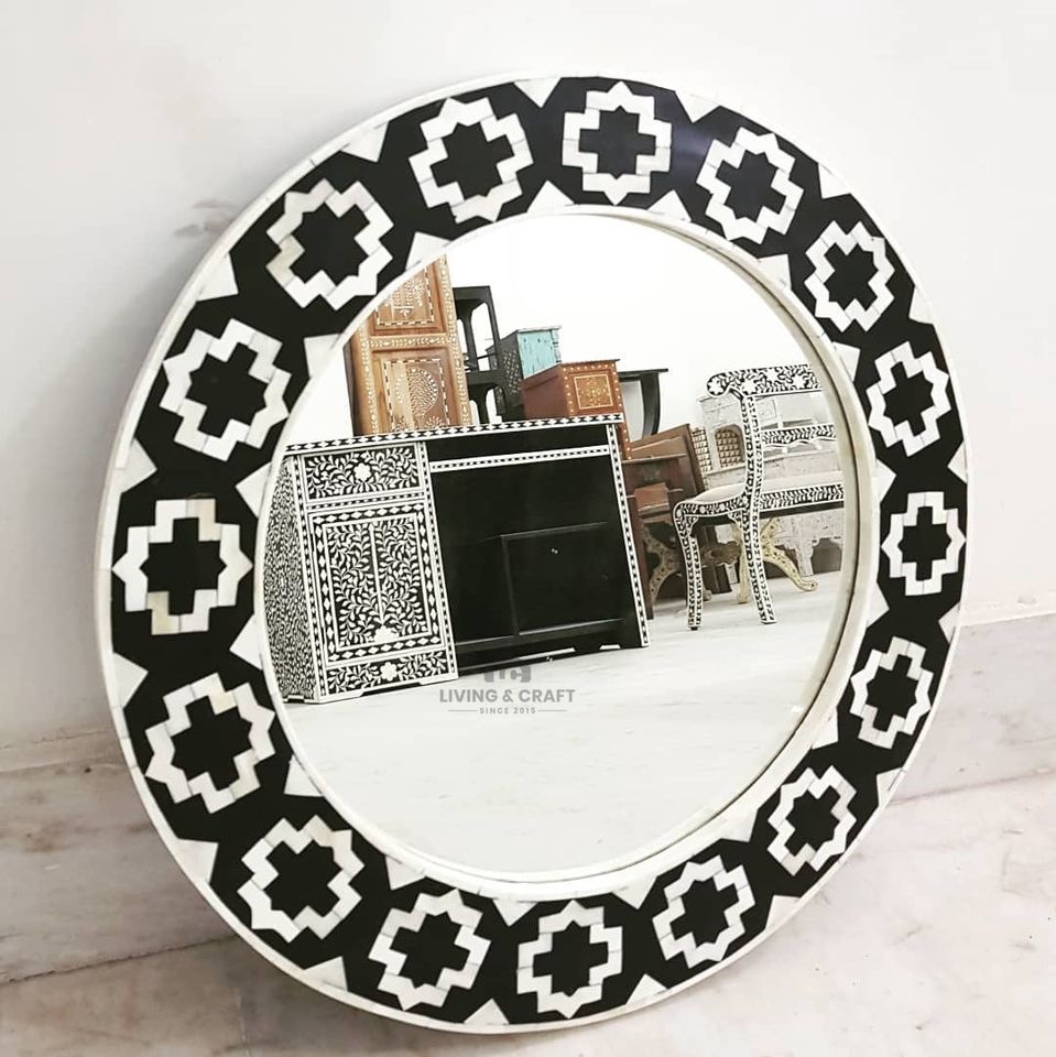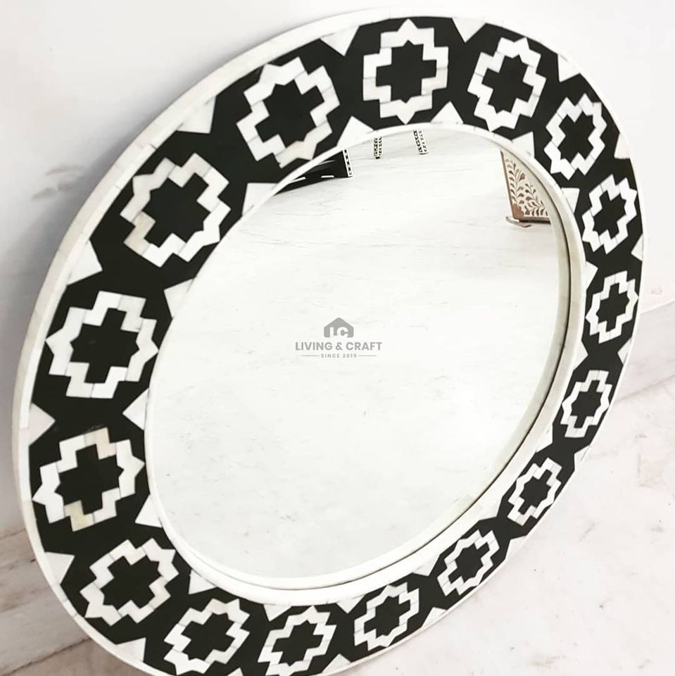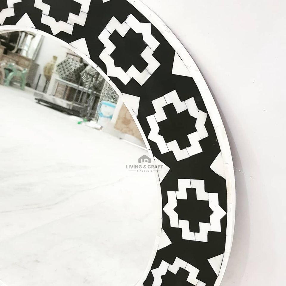 Espejo Redondo Decorativo de Pared con Incrustaciones de Hueso Hecho a Mano, Marco Geométrico Blanco y Negro, Espejo Decorativo de Lujo para el Hogar, Hotel e Interiores