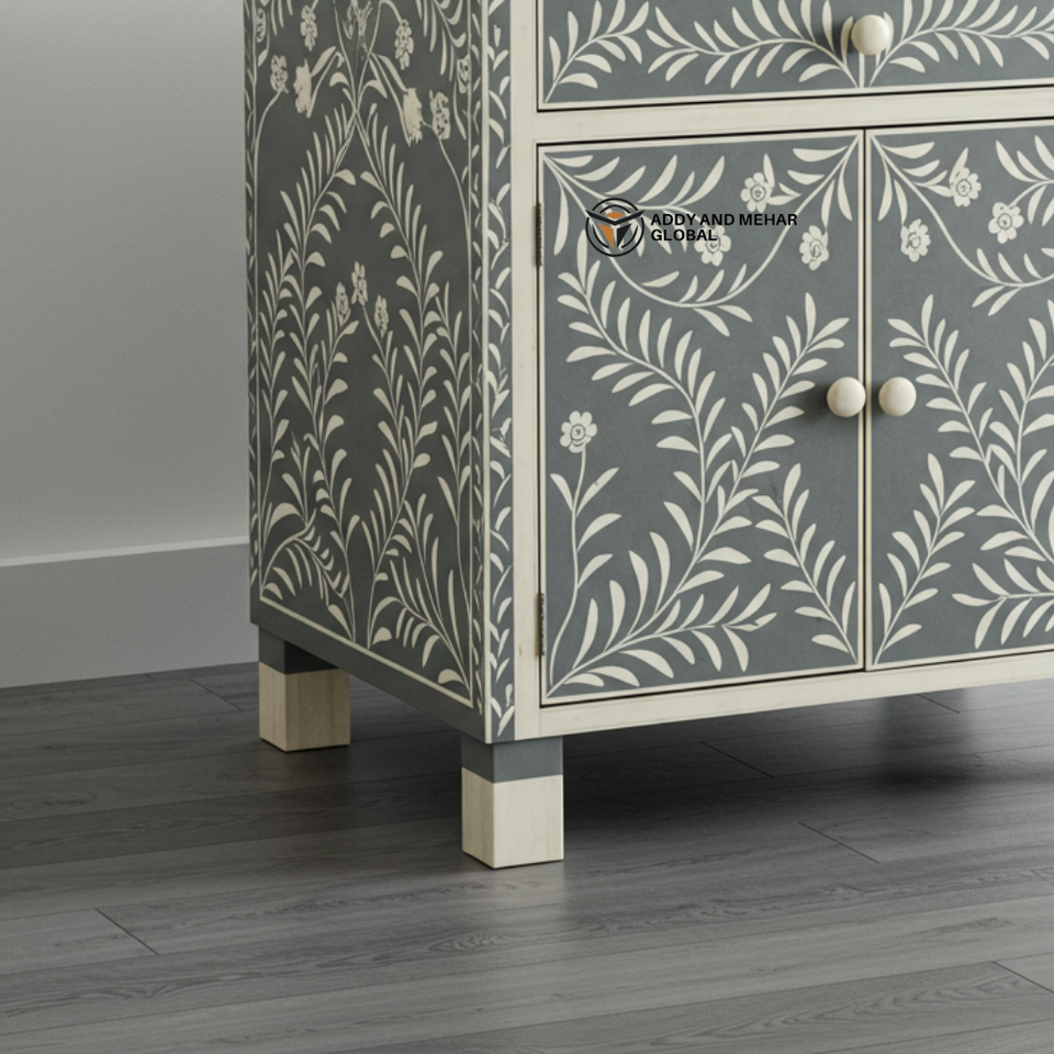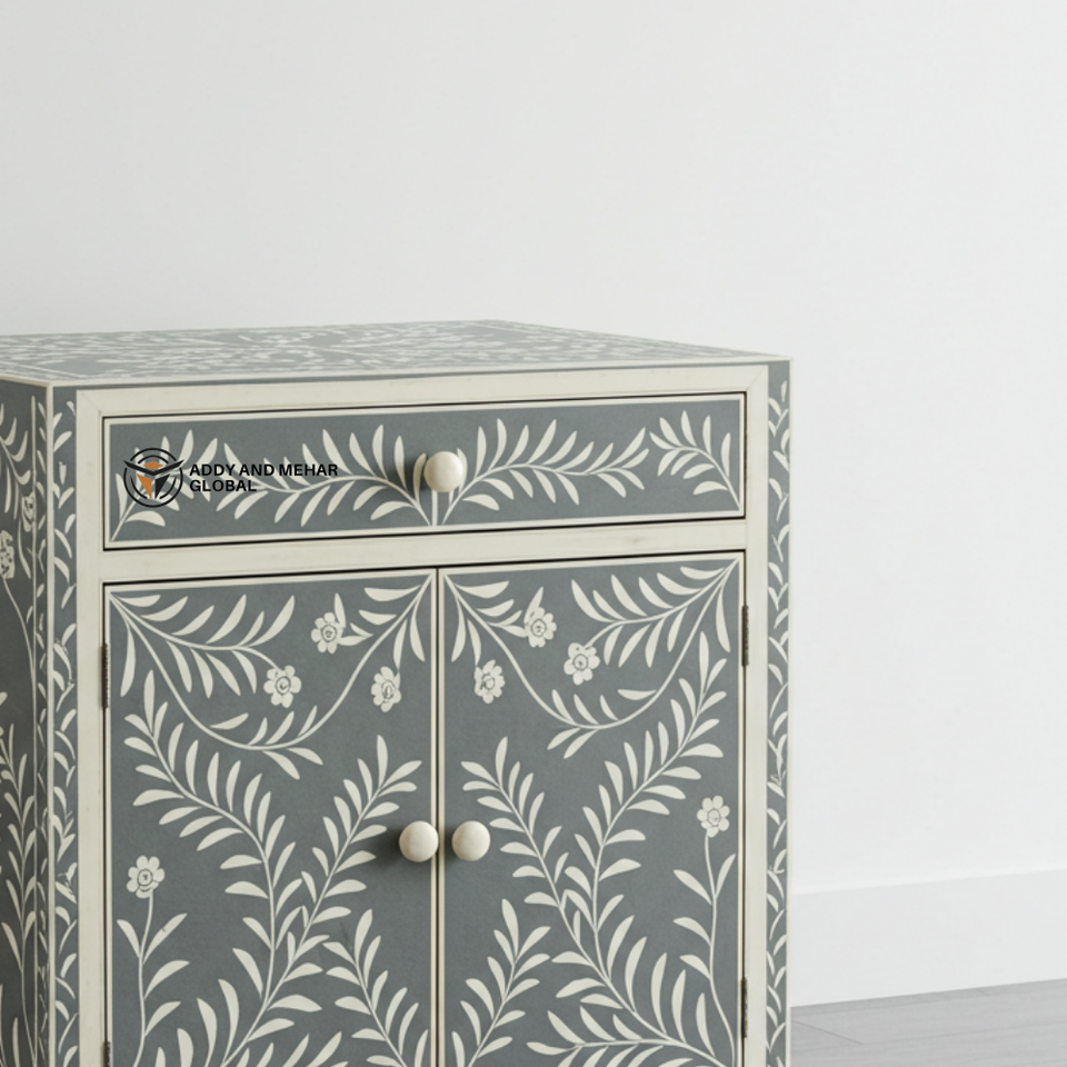 Mesita de Noche Moderna Hecha a Mano con Incrustaciones de Hueso Gris Ecológico, Diseño Floral de Vid, Tapa de Madera, Gabinete con 1 Cajón, Modelo Addy