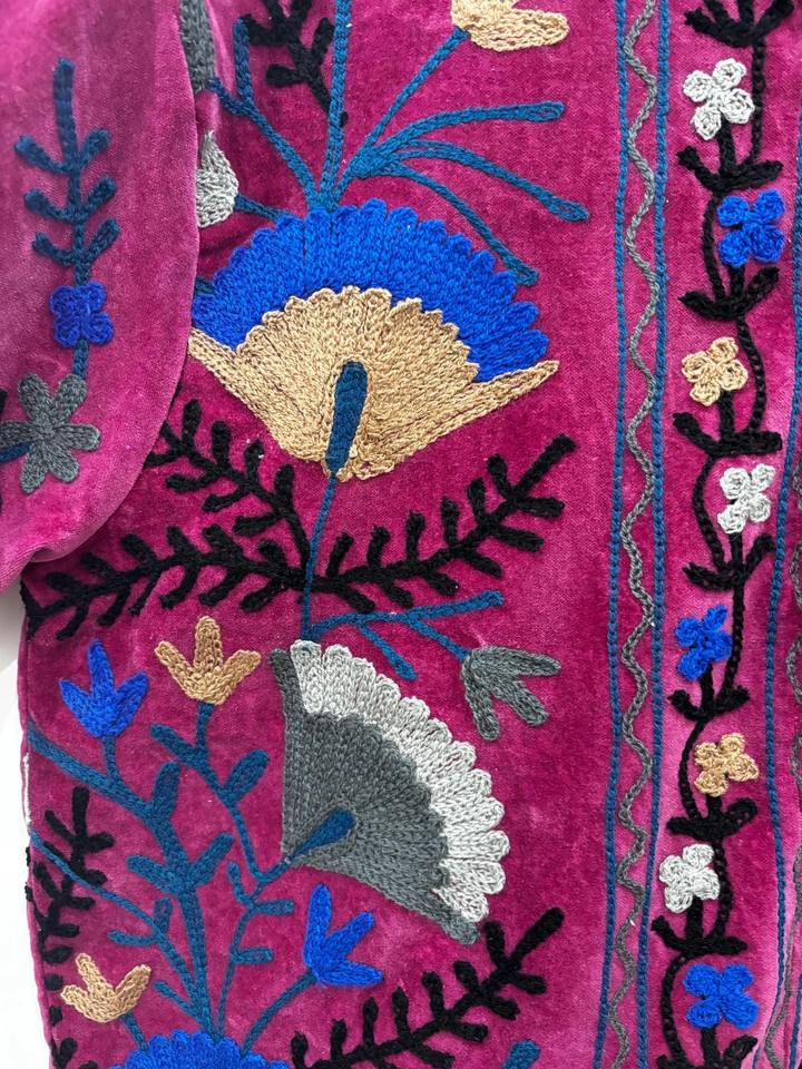 Chaqueta Corta Bordada Suzani de Terciopelo Floral con Forro y Botones Hechos a Mano para Mujer