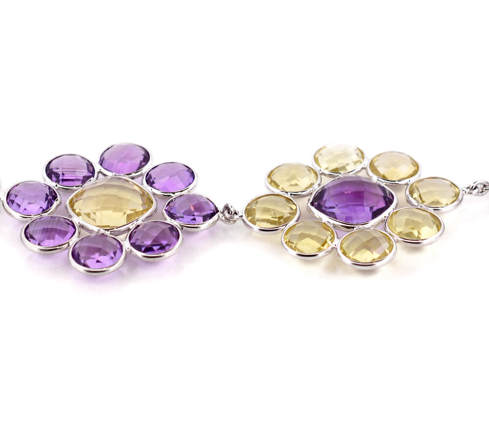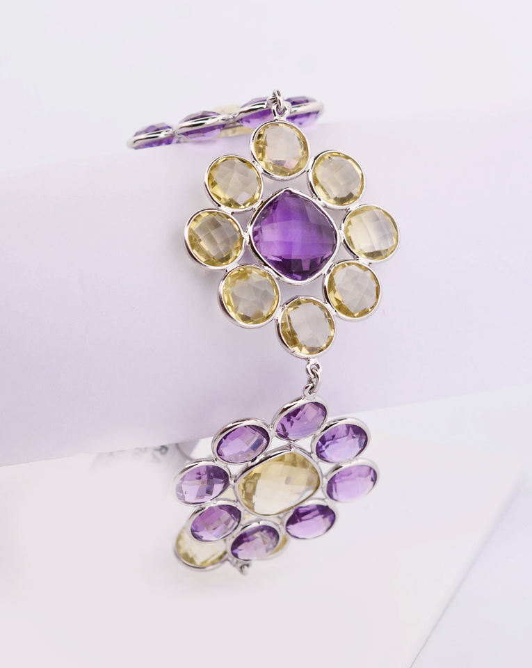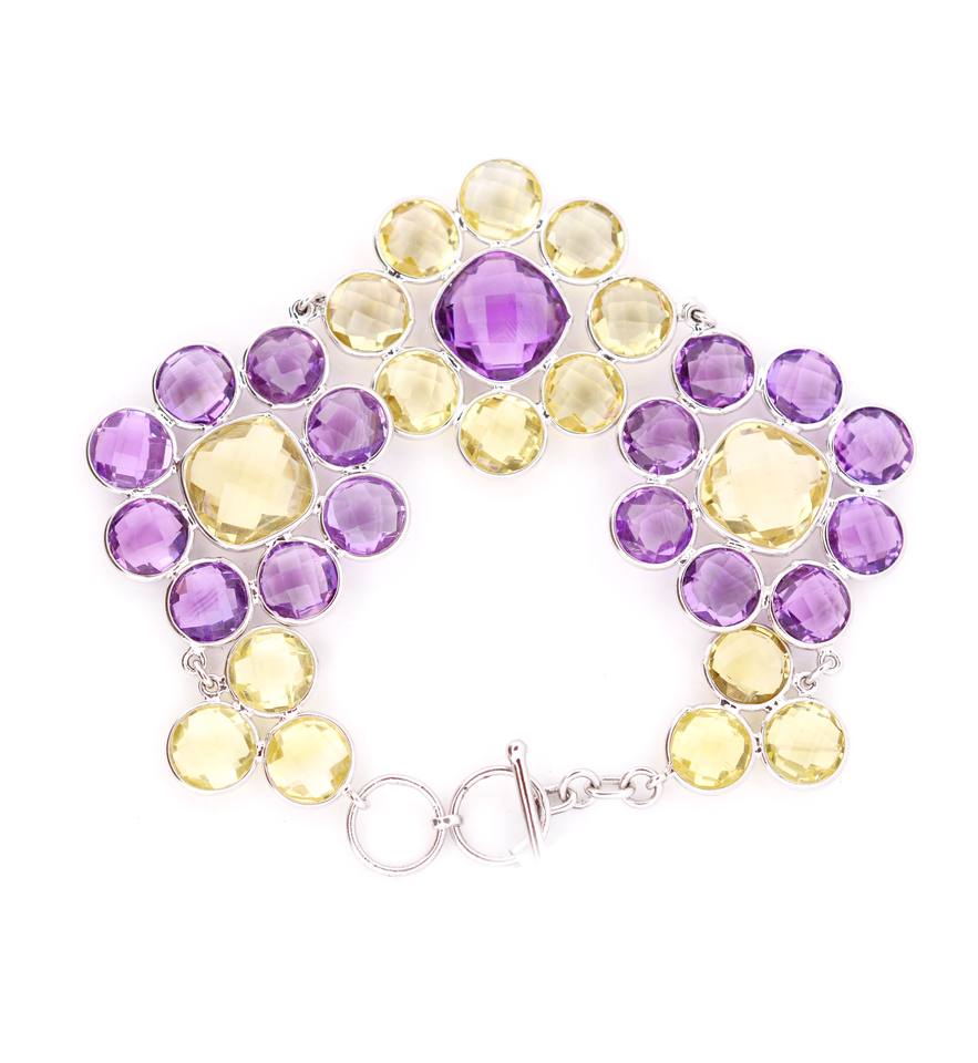 Pulsera artesanal de amatista y cuarzo limón con diseño de racimo audaz en plata de ley 925