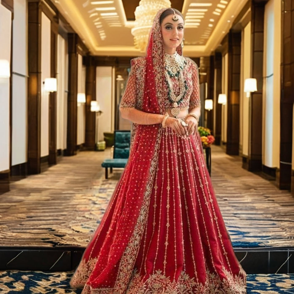 Hecho a mano pesado bordado terciopelo rojo nupcial Maxi Lehenga vestido de novia indio y paquistaní