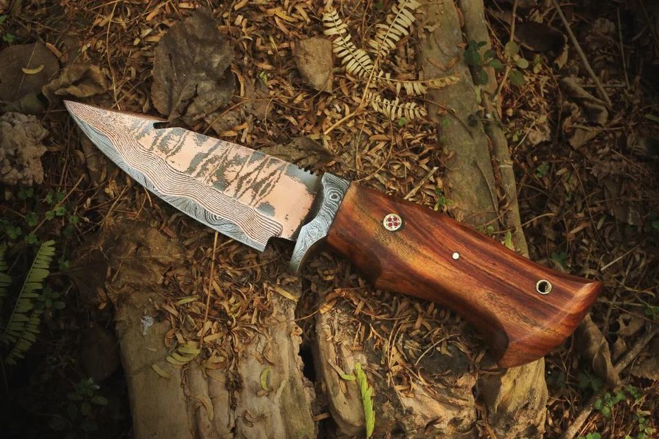 Cuchillo de Caza Artesanal de Alto Rendimiento, Acero Damasco y Cobre, Grado Industrial, Mango de Madera de Palisandro, Hoja Fija con Punta de Gota OEM