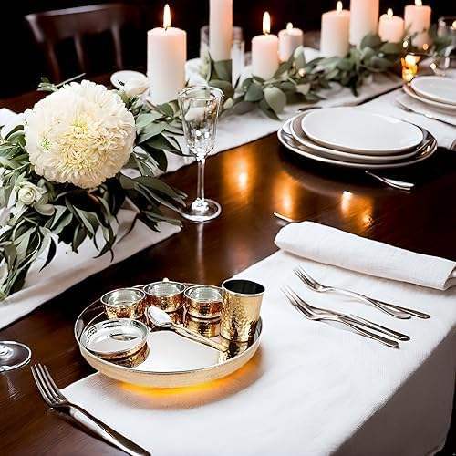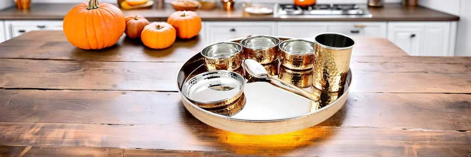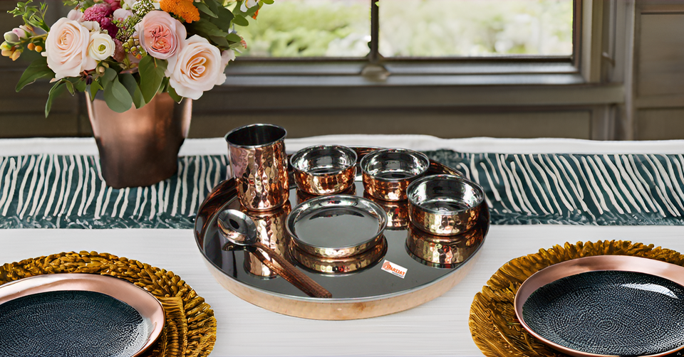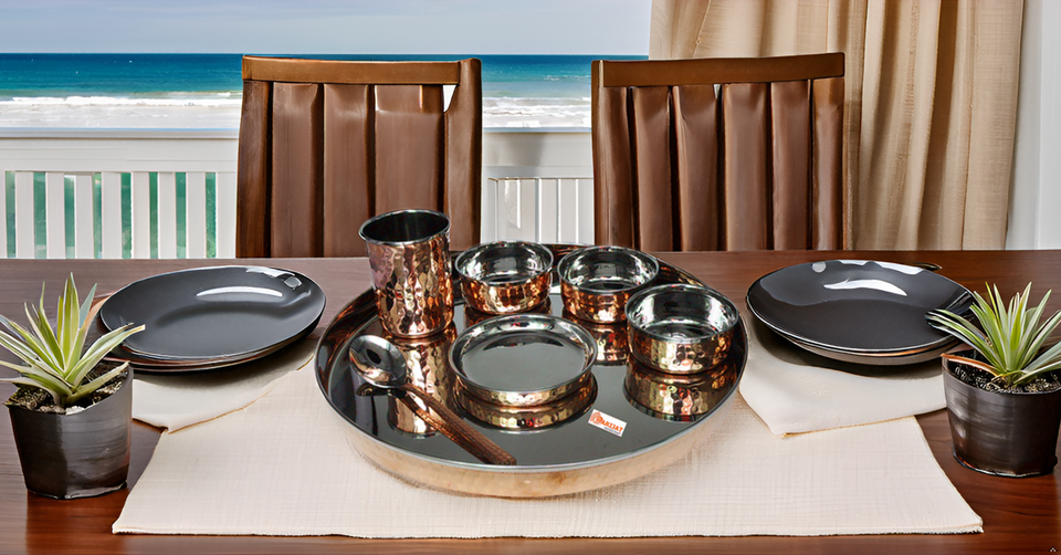 Juego de cena de cobre de acero en relieve tradicional indio hecho a mano, hermosa vajilla de regalo con cuencos Thali, cuchara de vidrio