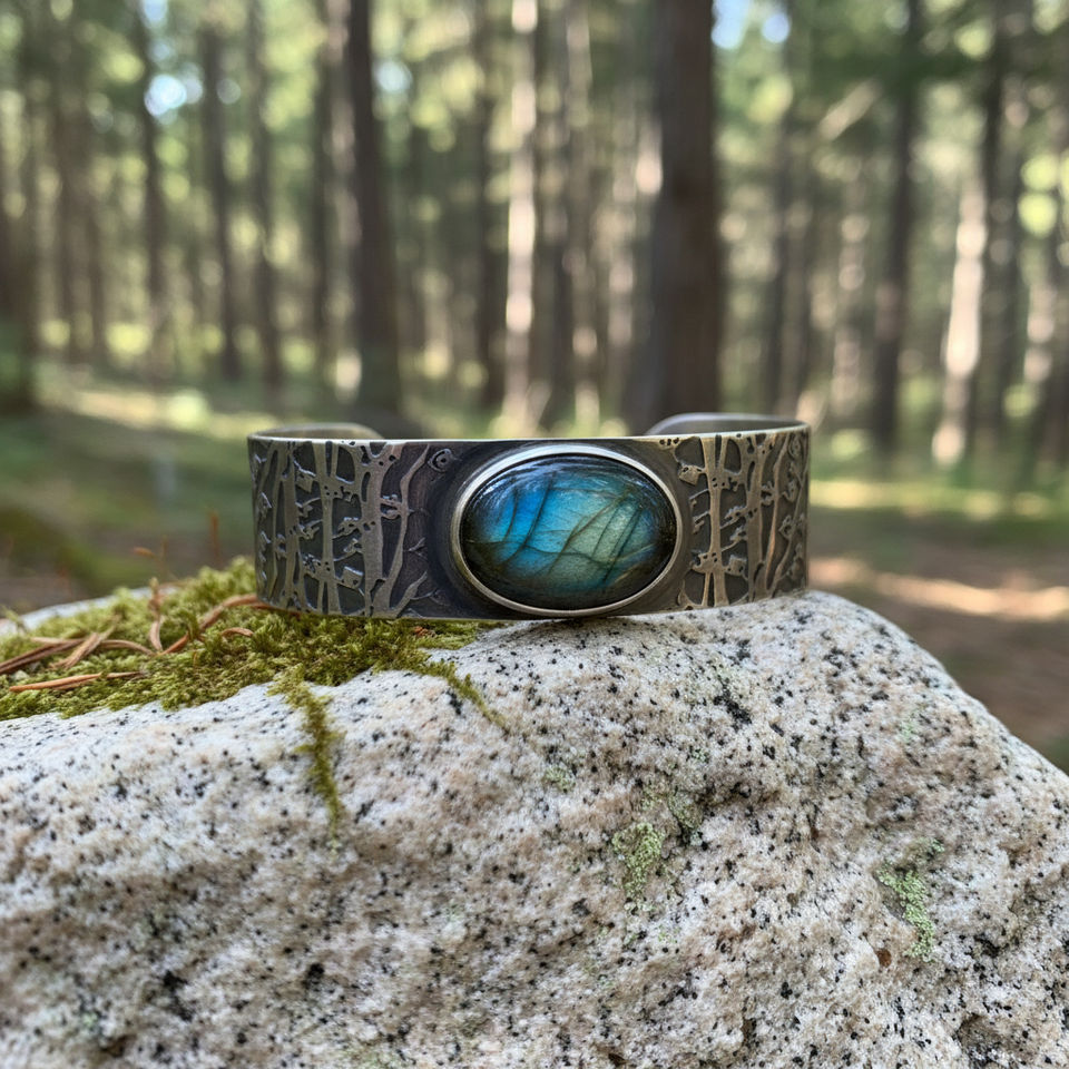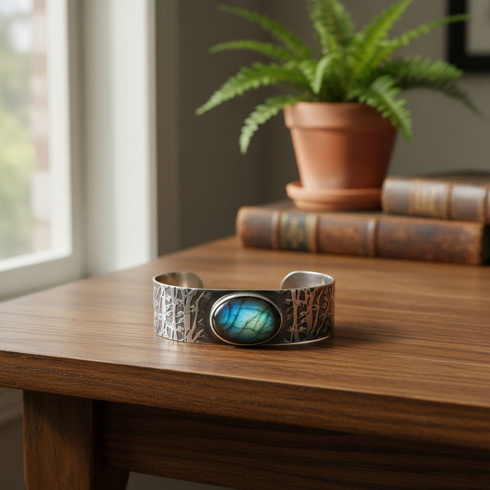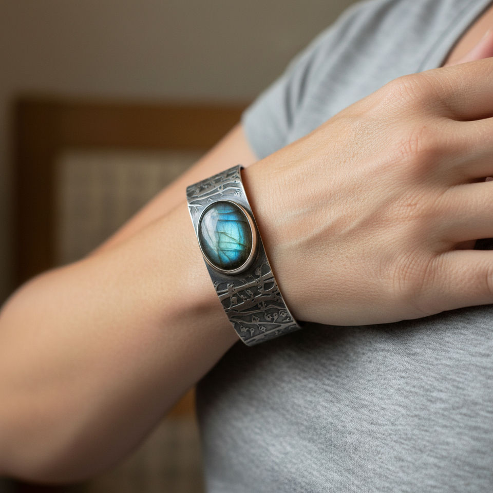 Brazalete de Labradorita Hecho a Mano con Diseño Inspirado en el Bosque, Joyería de Plata