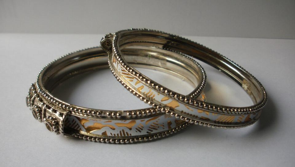 Brazalete de Cobre en Tono Plateado de Lujo Hecho a Mano con Elegante Incrustación de Patrón Tribal Blanco y Dorado y Borde Adornado con Cuentas