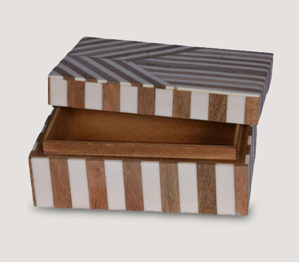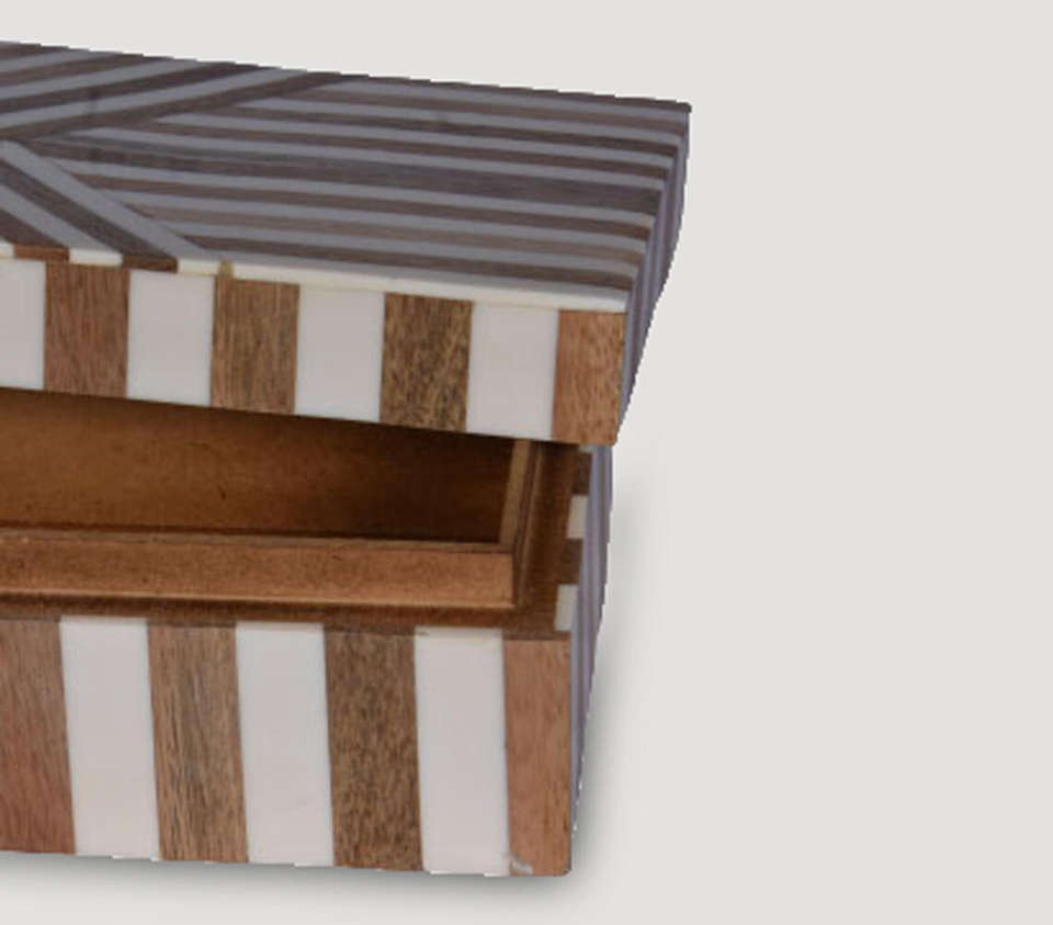 Caja Decorativa de Madera de Lujo Hecha a Mano con un Elegante Patrón de Incrustaciones en Rayas de Madera Natural y Crema, Rectangular, para Recuerdos