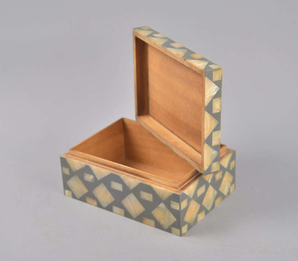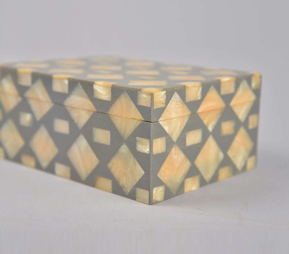 Caja Decorativa de Madera de Lujo Hecha a Mano con un Elegante Patrón de Incrustaciones de Mosaico Geométrico en Gris y Crema