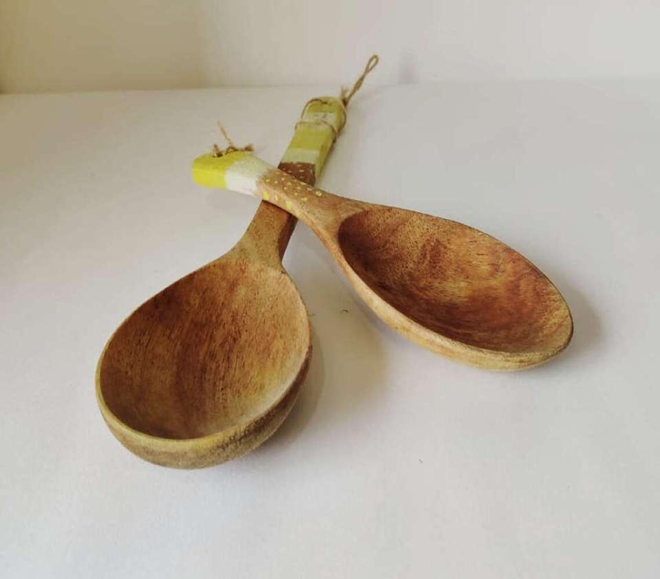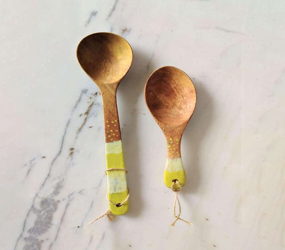 Juego de Cucharas de Madera de Mango Hechas a Mano con Mangos Artísticos Pintados a Mano en Amarillo y Blanco, Cucharas Decorativas de Mango Largo para Servir