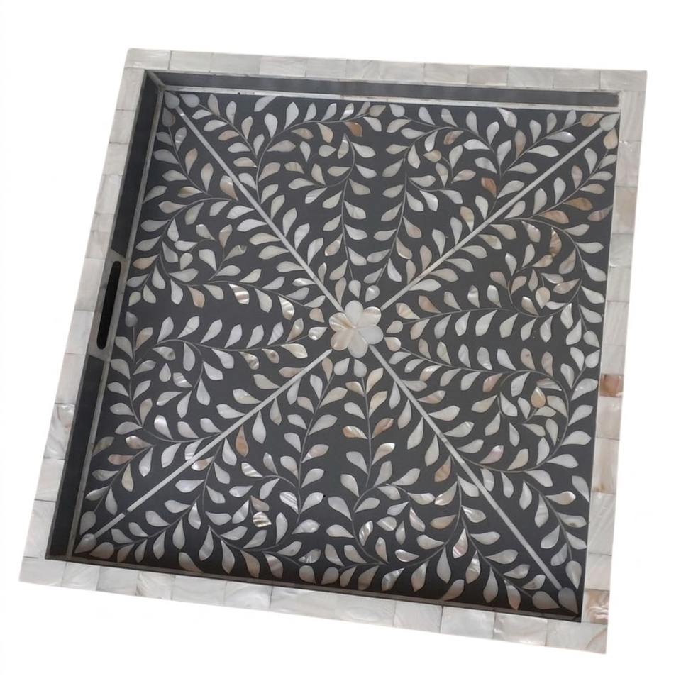 Bandeja de servir artesanal con incrustaciones de nácar, elegante bandeja decorativa con diseño floral de vid en nácar blanco para mesa de café, decoración de lujo para el hogar.