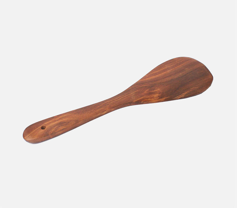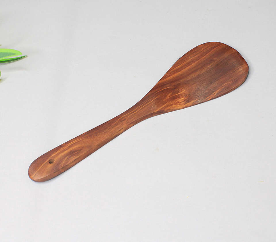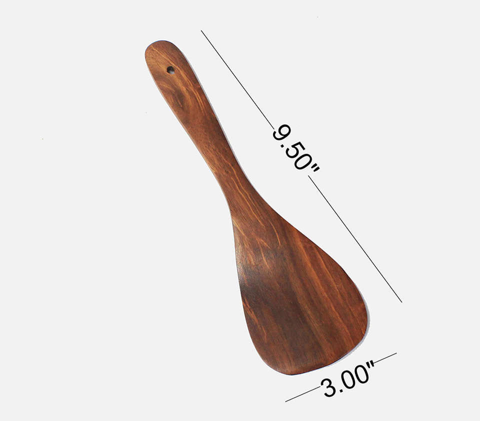 Espátula Artesanal de Madera de Mango Natural de Grano Oscuro con Longitud Total de Nueve Puntos Cinco Pulgadas, Decorativa, Ancha de Tres Pulgadas y Curvada